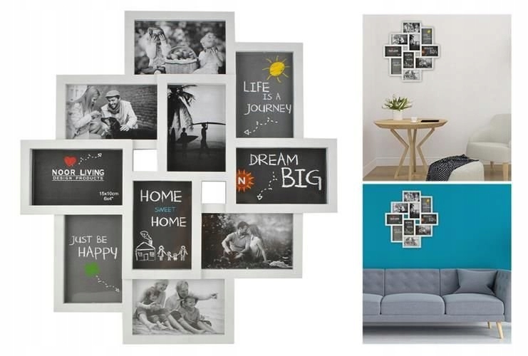 кадр для 10 фотографий h1> - Практический b>- кадр будет содержать до 10 фотографий с максимальными размерами 10x15 см (снаружи вы можете увидеть формат 9x14cm); Благодаря объединенным элементам мы сохраняем поверхность дома, чтобы установить традиционные 10 кадров; Простой способ повесить несколько фотографий без усилий. Он хорошо работает как хороший дизайн интерьера и дает им характер. Фильм защищает фотографии от разрушения и пыли. Благодаря вращающимся петлям задней панели можно легко удалить, чтобы заменить фотографии. Вес 700G,