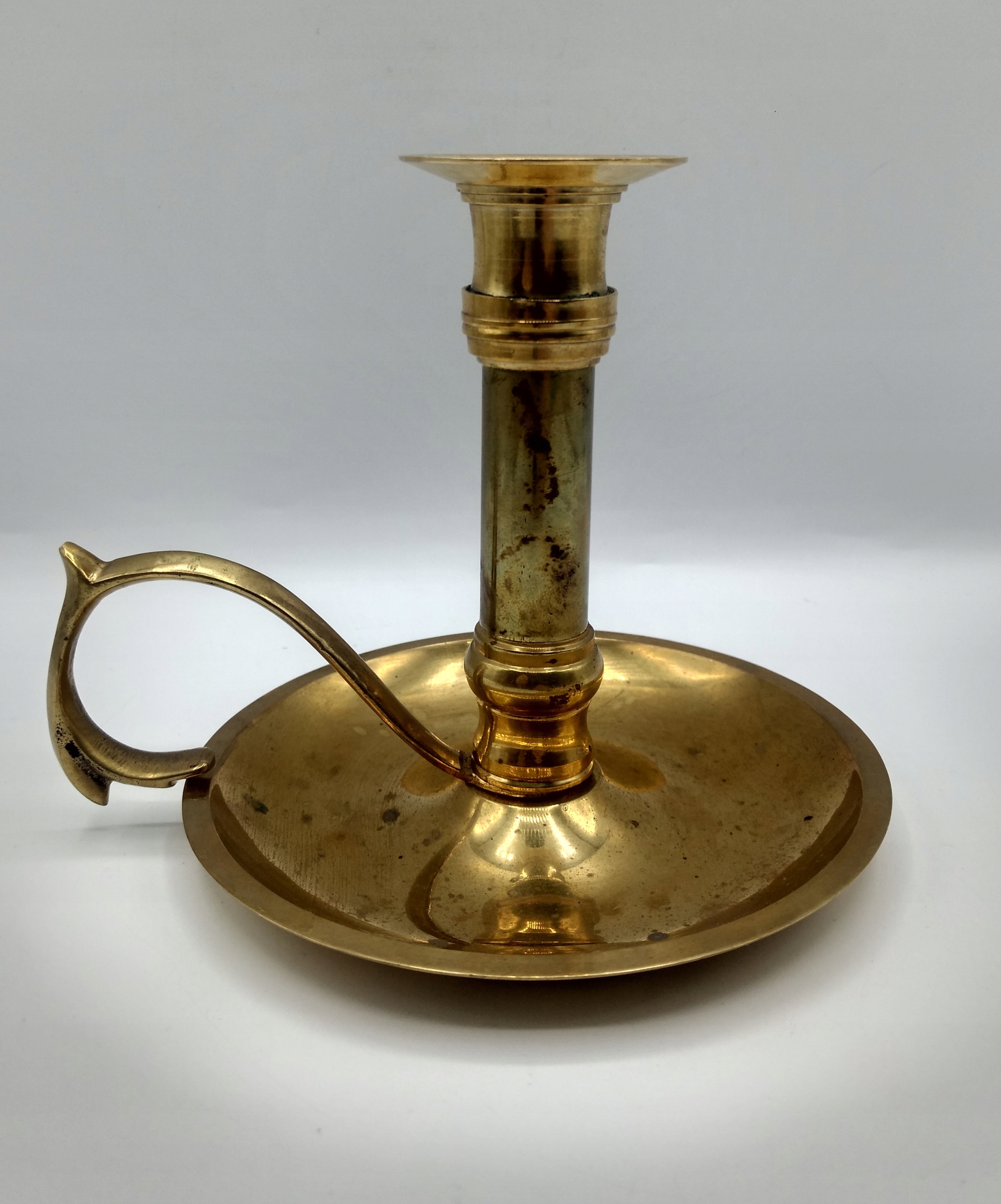 Он изготовлен из латуни, вещь старая, латунь уже красиво потускнела. Тяжелый, вес около 360 г, ширина с ручкой: 15,8 см, без ручки 13,4 см, высота 12,7 см, отверстие для свечи 2,2 см. Вещь возрастная, в очень хорошем состоянии, без скрытых дефектов, антикварная, коллекционная. РЕКОМЕНДУЮ.