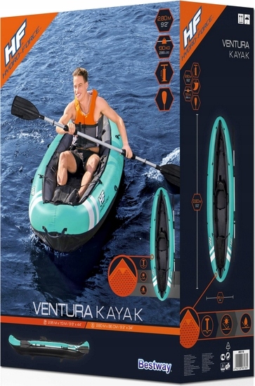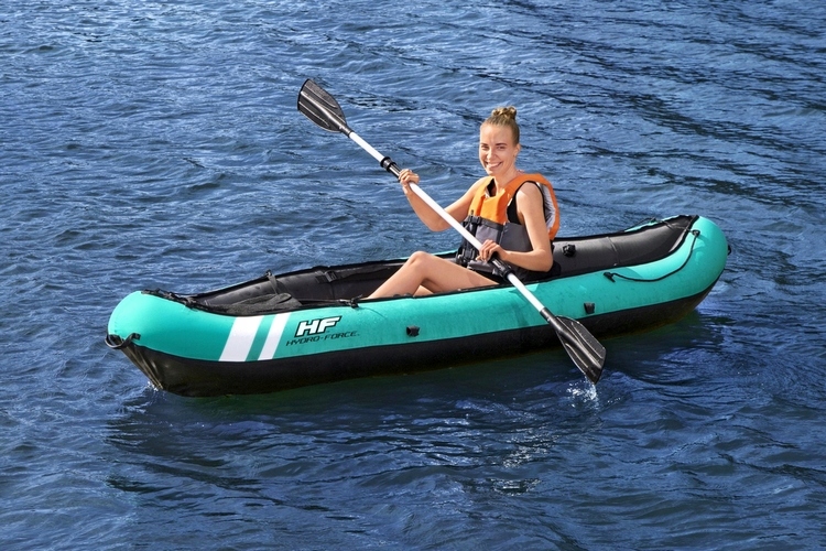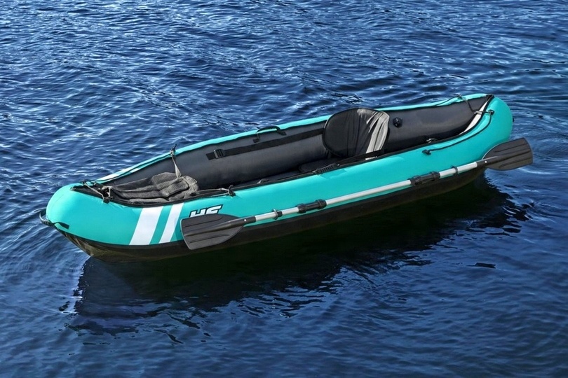 При полном надувании с помощью ручного насоса длина каяка составляет 2,80 м, а грузоподъемность - до 130 кг.
