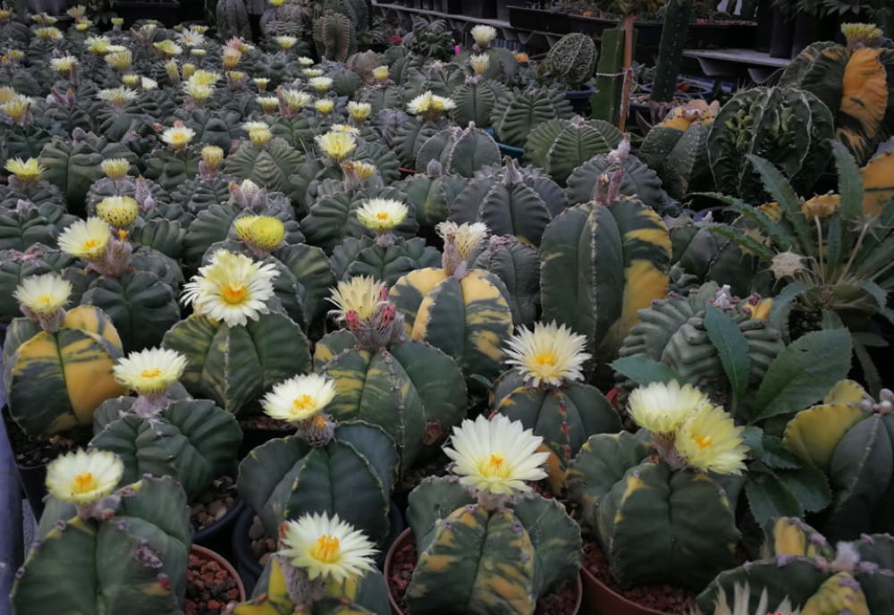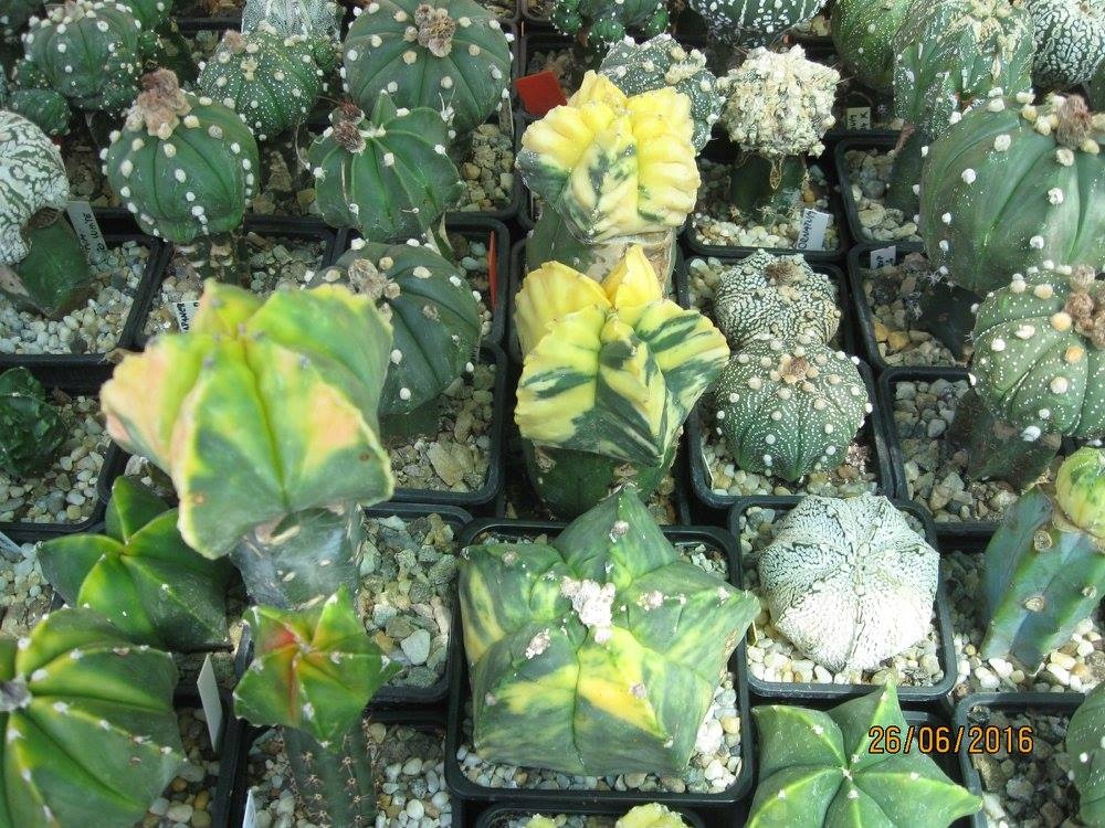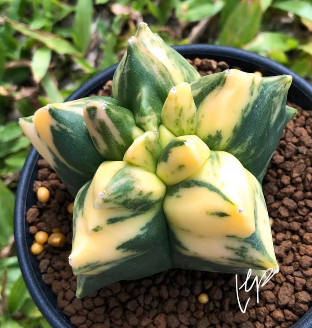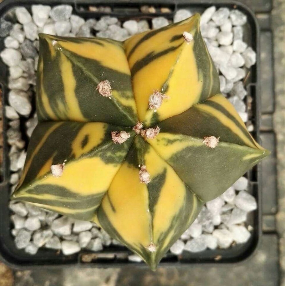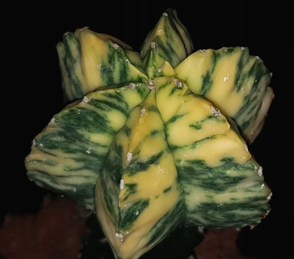 Вообще говоря, чем больше «зубья пилы», а также чем они круглее и плонее, тем лучше. Форма Variegata — красивая пестрая форма с секторами, пятнами или полосами отчетливых оттенков желтого, оранжевого или розового и зеленого цветов. Стебель от пятиугольной до почти сферической формы, высотой 22-40 см и диаметром 5-10 см. Цветки, как и у известного астрофитума мириостигмы, бледно-желтые, блестящие и шелковистые, появляются с весны до лета.