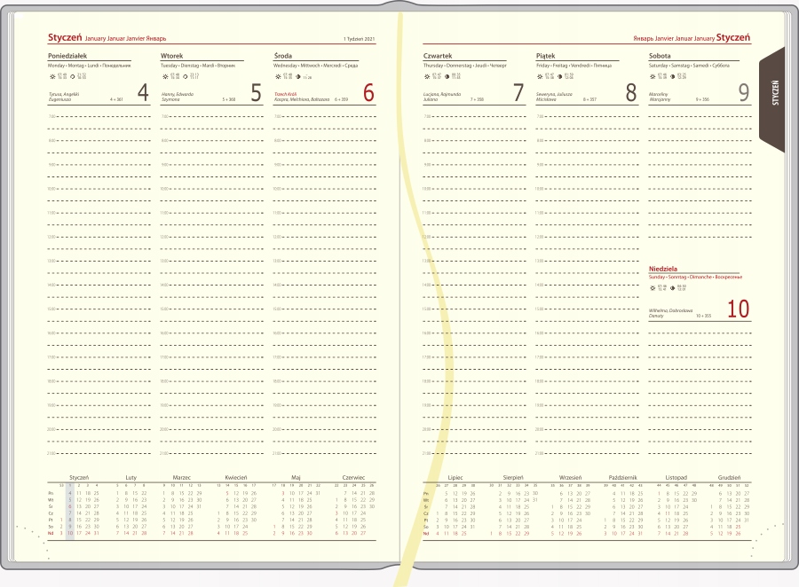 - Календарь: 5 языков (PL, EN, DE, RUS, FR), именины и праздники, фазы луны, восходы и закаты, план на весь год внизу календаря.