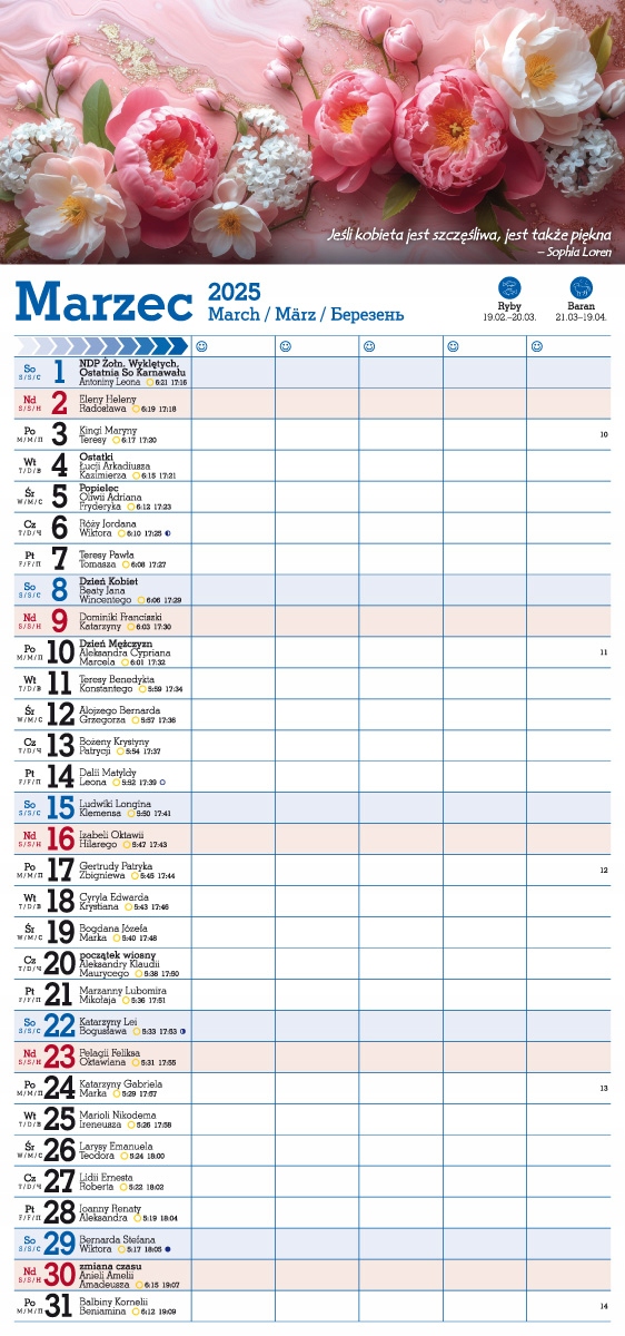 - В календаре указано название дни, названия праздников, время восхода и захода солнца, фазы Луны и знаков Зодиака