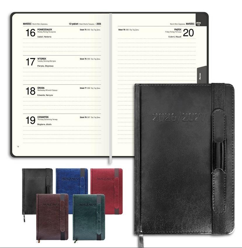 Формат А5 и прочная, имитирующая кожу, твердая обложка обеспечивают комфорт и долговечность, а ластик с держателем для ручек позволяет всегда иметь под рукой все необходимое. Благодаря этому календарь становится не только инструментом планирования, но и незаменимым элементом повседневной жизни. работы.