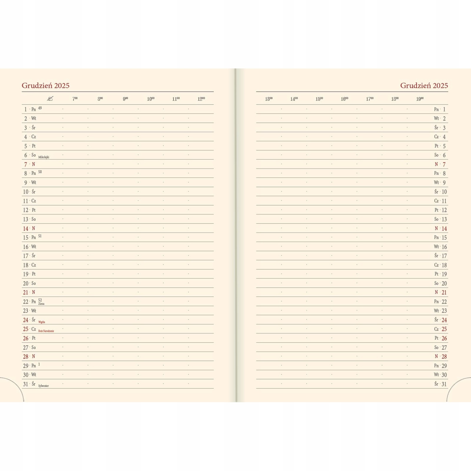 <р> Изготовлен из высококачественного шпона Vivella, напоминающего кожу, он мягкий и нежный на ощупь и имеет привлекательную полуматовую поверхность. <р> Тиснение года на корешке и возможность персонализации делают этот календарь сочетающим в себе функциональность и стиль. <р> Модель имеет твердый чехол СТАНДАРТ с дополнительным слоем губки, что обеспечивает долговечность и комфорт использования. <р> Внутренняя часть календаря состоит из 336 ежедневных страниц, отпечатанных серо-бордовым цветом на кремовой бумаге плотностью 70 г/м². <р> Печатные реестры облегчают быстрый доступ к отдельным месяцам. <р> Календарь доступен на пяти языках: польском, английском, немецком, французском и украинском. <р> Дополнительные элементы включают угловую перфорацию, серую ленту для разметки страниц, кремовую повязку на голову и практичную административную карту Польши со штрих-кодом на форзаце. <р> Календарь содержит богатый информационный сегмент, в том числе: личные данные, годовые календари, ежемесячный и годовой планировщик, карты, международные праздники, преобразования единиц измерения, часовые пояса и контактные данные. <ул>Продукт поставляется из Польши.