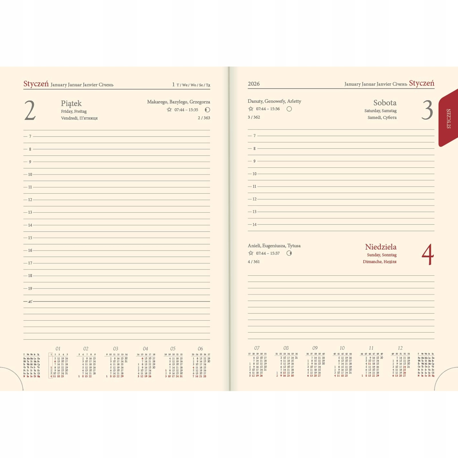 <р> Изготовлен из высококачественного шпона Vivella, напоминающего кожу, он мягкий и нежный на ощупь и имеет привлекательную полуматовую поверхность. <р> Тиснение года на корешке и возможность персонализации делают этот календарь сочетающим в себе функциональность и стиль. <р> Модель имеет твердый чехол СТАНДАРТ с дополнительным слоем губки, что обеспечивает долговечность и комфорт использования. <р> Внутренняя часть календаря состоит из 336 ежедневных страниц, отпечатанных серо-бордовым цветом на кремовой бумаге плотностью 70 г/м². <р> Печатные реестры облегчают быстрый доступ к отдельным месяцам. <р> Календарь доступен на пяти языках: польском, английском, немецком, французском и украинском. <р> Дополнительные элементы включают угловую перфорацию, серую ленту для разметки страниц, кремовую повязку на голову и практичную административную карту Польши со штрих-кодом на форзаце. <р> Календарь содержит богатый информационный сегмент, в том числе: личные данные, годовые календари, ежемесячный и годовой планировщик, карты, международные праздники, преобразования единиц измерения, часовые пояса и контактные данные. <ул>Продукт поставляется из Польши.