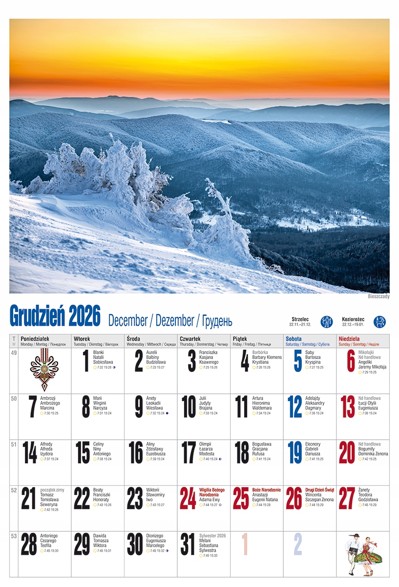 НАСТЕННЫЙ КАЛЕНДАРЬ ОДНОСТОРОННИЙ А3 ДЛЯ ШПИТАЛИ ПОЛЬСКОГО КЛИМАТА