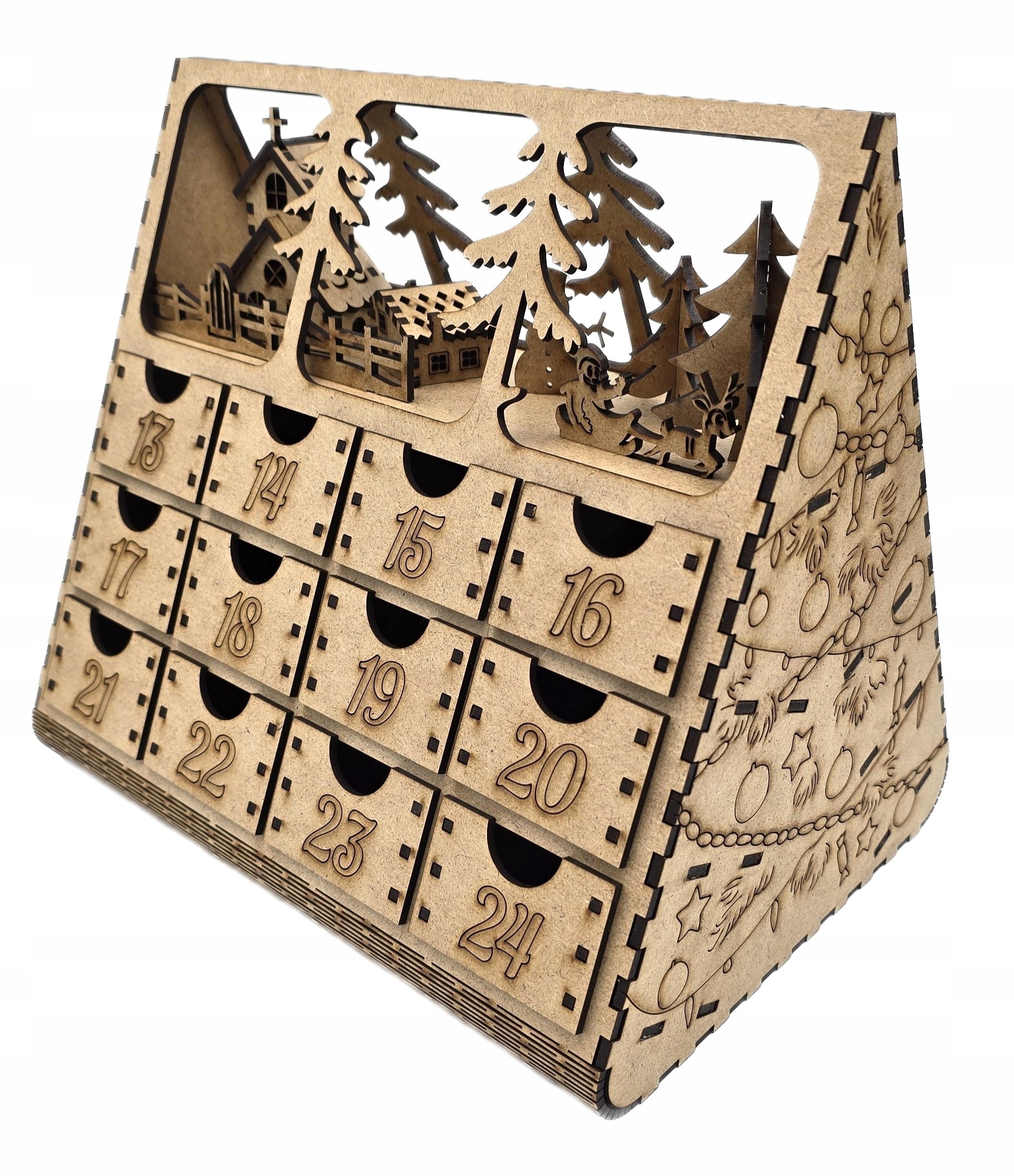Деревянный Адвенный календарь в форме рождественской елки с 24 ящиками каждый день ожидания, когда праздники станут особенными. Его уникальная рождественская гравюра по бокам добавляет очарование и подчеркивает магический характер Рождества, а также элегантное внутреннее украшение ul>
