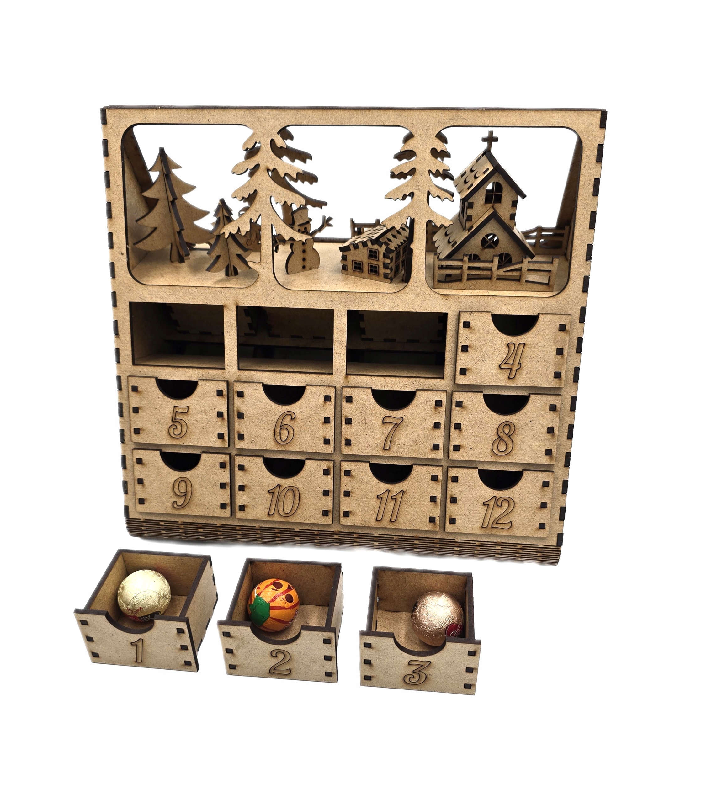 - Универсальность: Вы можете поместить его на стол, полку или стол - в качестве календаря Адвента или рождественского украшения. Гравюра и красивый ландшафт в верхней части календаря они придают ему уникальное очарование