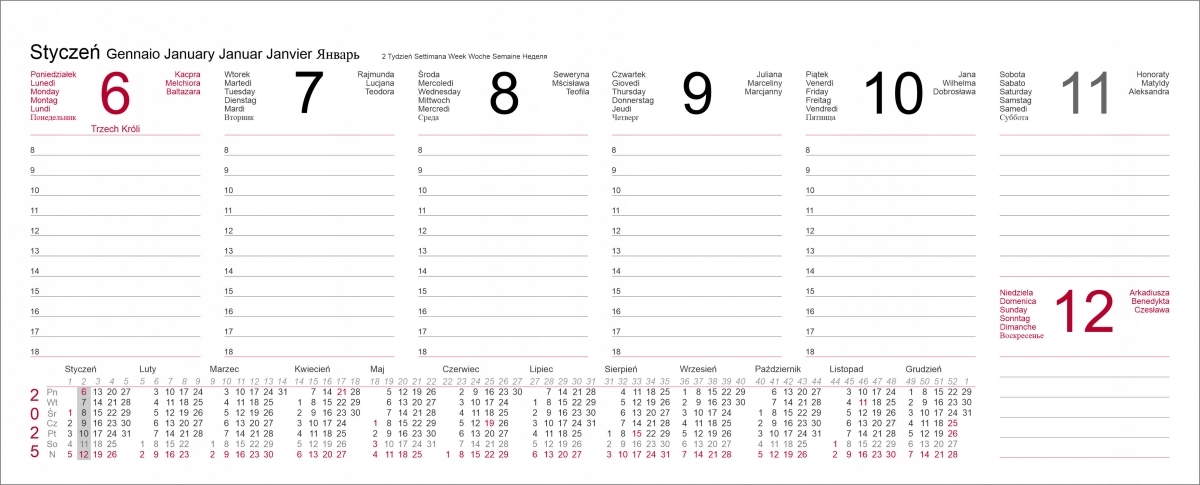 Удобный календарь в еженедельной системе содержит много места для заметок на каждый день. Календарь охватывает весь период 2025 года. В каждый день с понедельника по пятницу отмечены ноты с 8 до 18. На каждой карте мы находим количество текущей недели и четкий короткий календарь всего года с выделенной текущей неделей. Благодаря всей этой информации, календарь очень практичен и легко с его помощью, чтобы сохранить контроль над реализацией задач и приближающихся терминов.