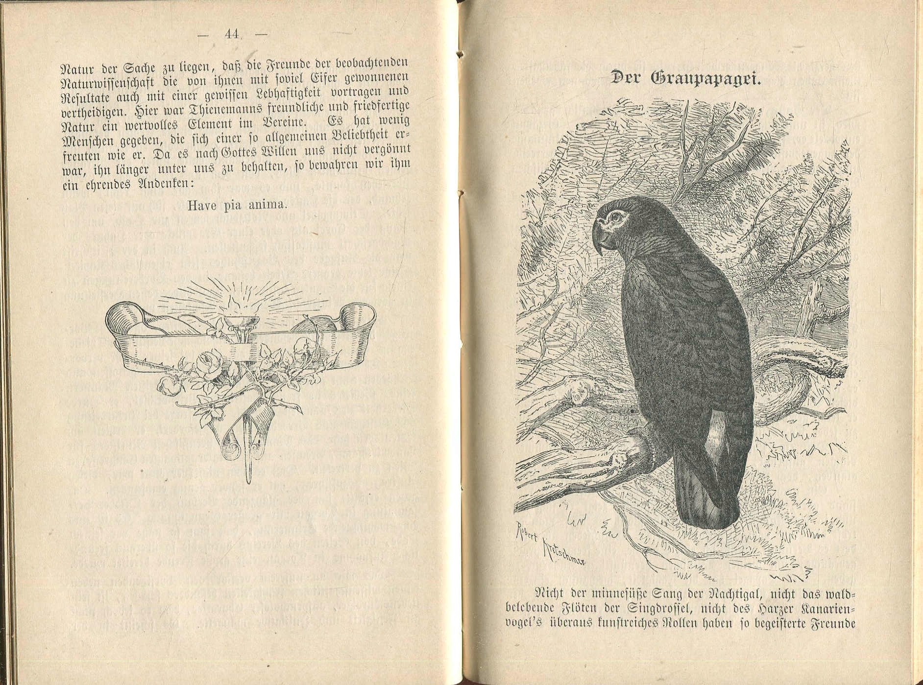 Содержание на немецком языке. Богато иллюстрированный альманах, сочетающий в себе элементы календаря, атласа птиц и руководства по разведению. Содержит описания видов (как экзотических, так и европейских), советы по кормлению, разведению и скрещиванию, а также анекдоты и заметки для любителей орнитологии. Он упоминает различные породы канареек и домашних птиц, что показывает, что разведение декоративных птиц было популярным хобби в то время.