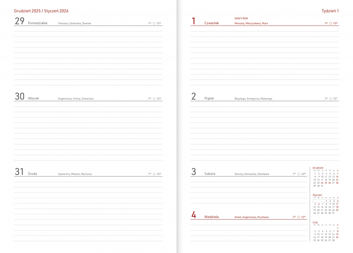 - calendar on calendar on 30.06.2025 to 23.08.2026 (July and August in a 2 -week arrangement on page 1, other months in a weekly system - 1 week on 2 neighboring pages)