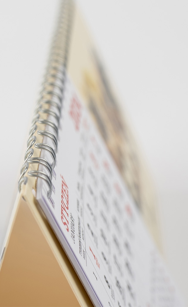Основа календаря загибается снизу, а затем приклеивается. Следов склейки нет. Календари отправляются вам уже в сложенном виде, достаточно загнуть их основание внизу в месте сгиба и положить календарь на стол.