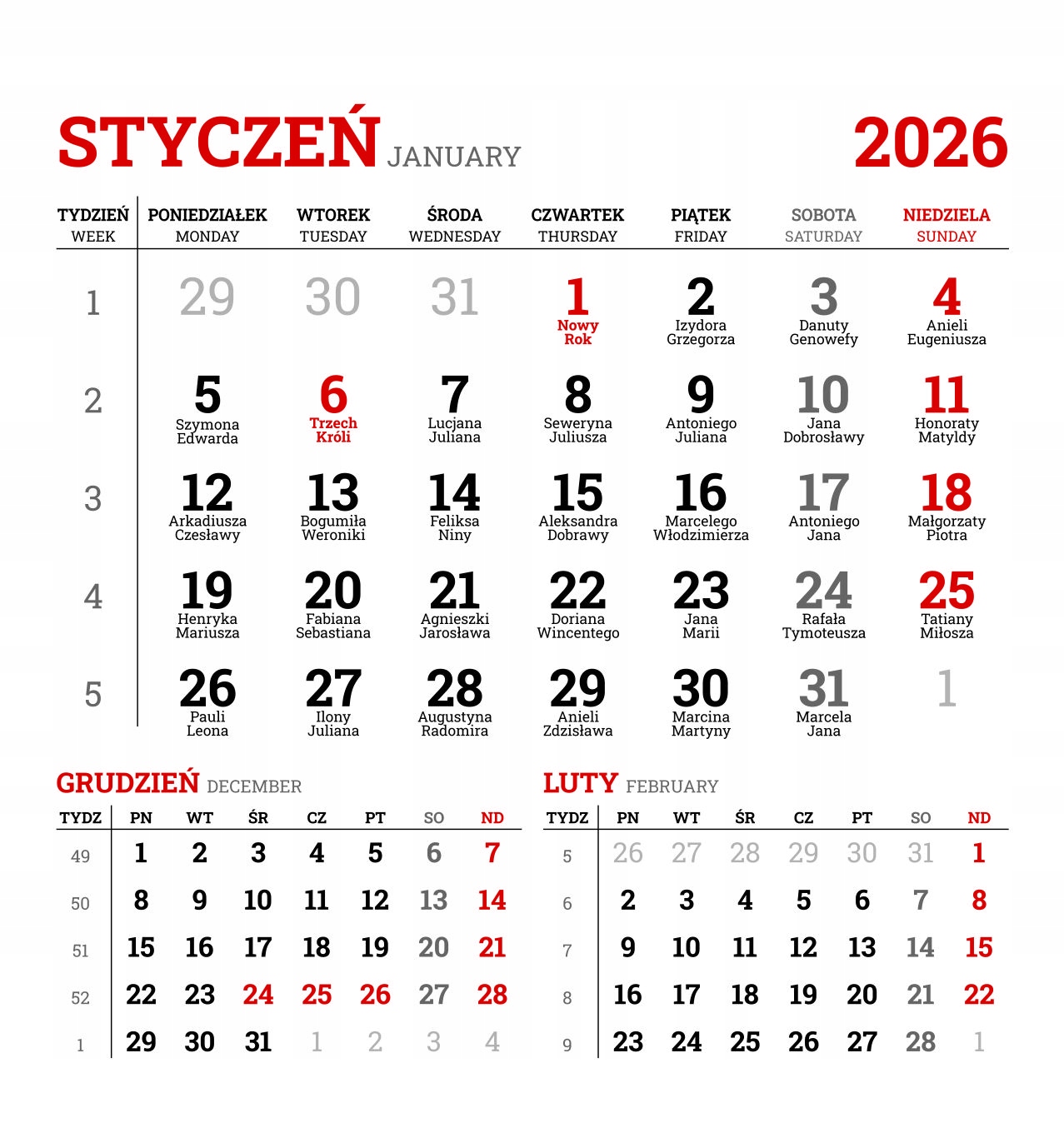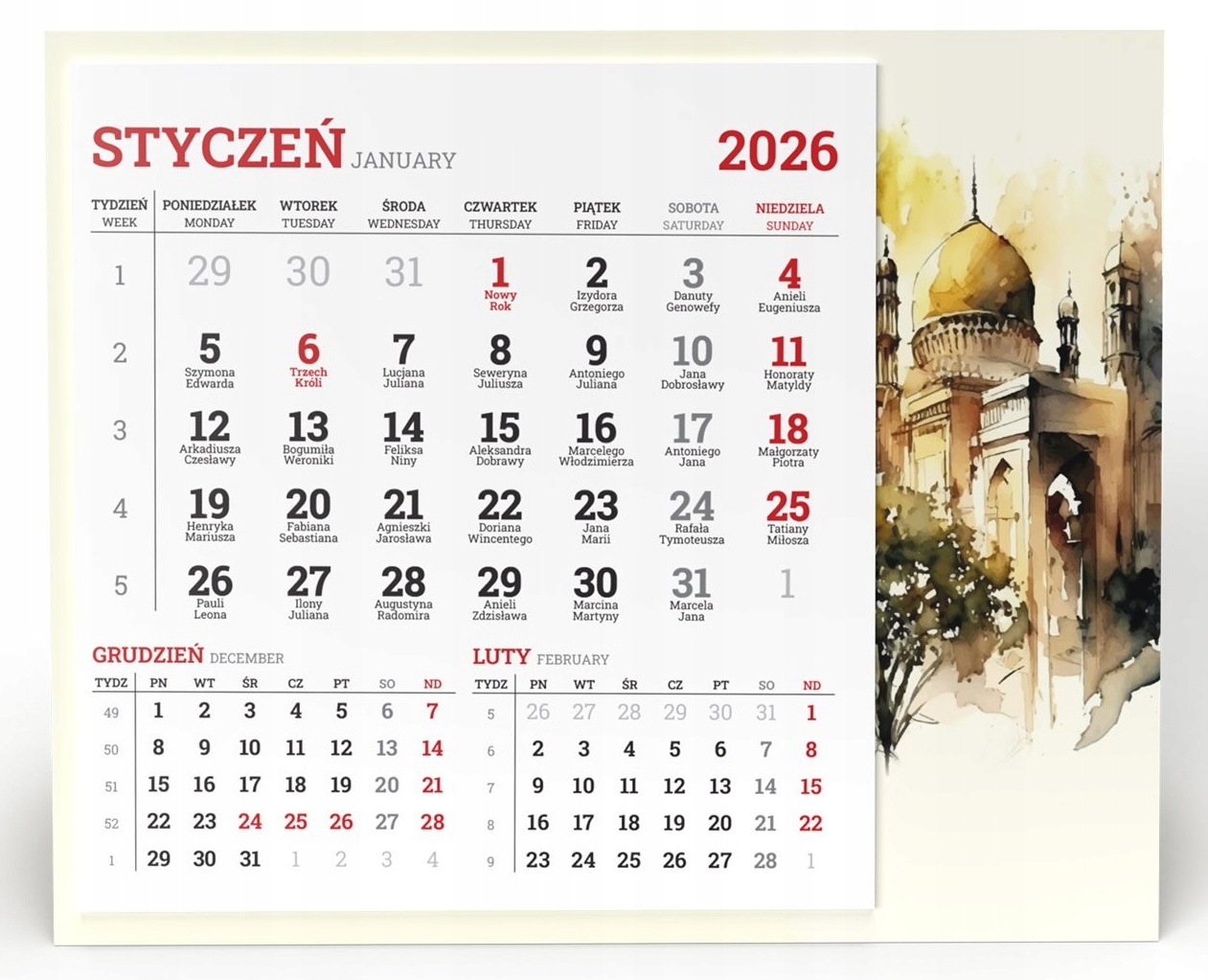 Стандартный календарь красный и черный цвета. Помимо стандартного макета календаря на месяц, они содержат такие полезные элементы, как номера недель и информацию об именинах. Календари приклеиваются с обратной стороны с помощью специального прочного скотча.