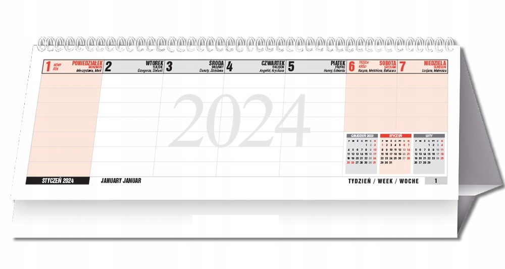 двусторонний, трехязычный (PL, GB, D) с именинами; двухцветная печать на