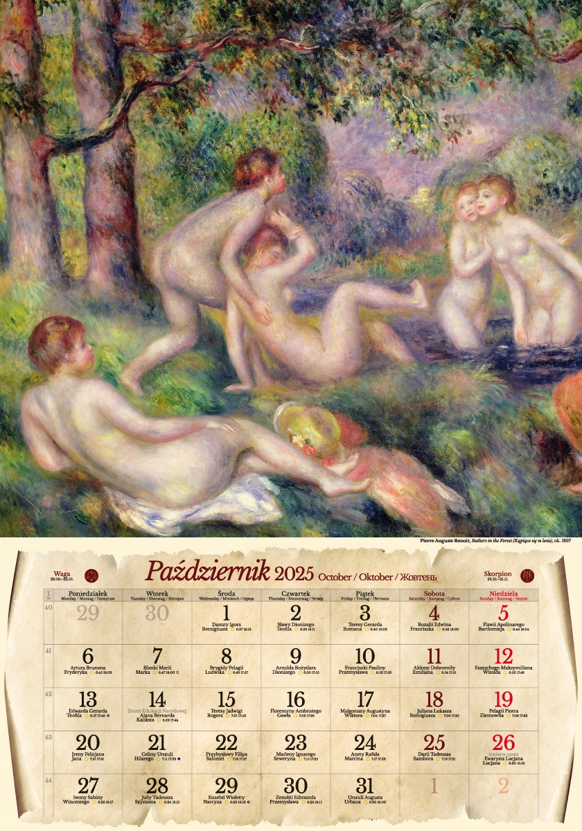 Включает именины, названия праздников, время восхода и захода солнца, фазы Луны и знаков Зодиака.