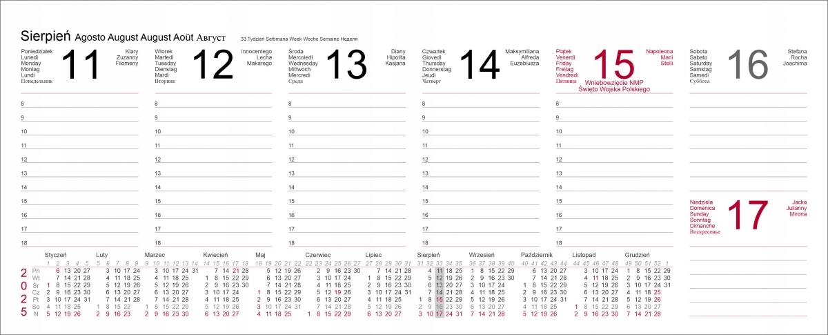 Кроме того, календарь отмечен днем имени, государственными и религиозными праздниками. В начале календаря прозрачный план всего 2024, 2025 и 2026 гг.