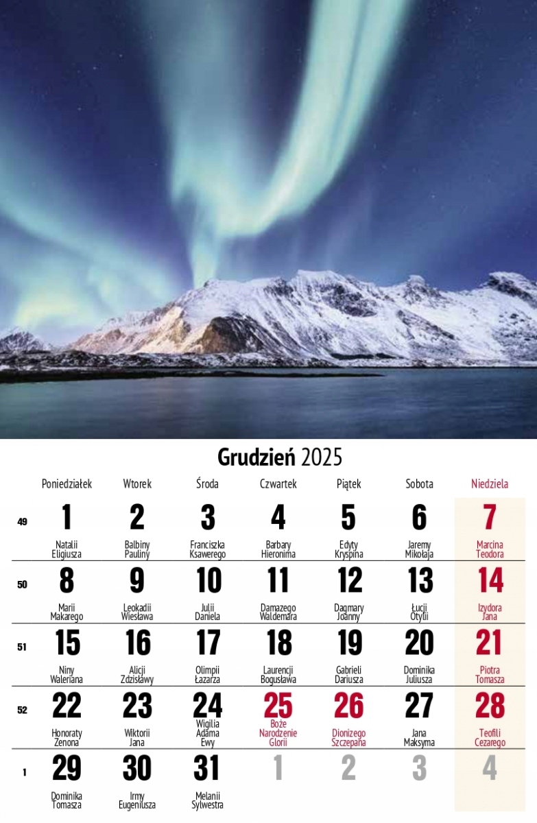 Календарь столов. Календарь спирали с гастролиями, напечатанными с обеих сторон. Календарь указывает на имени дни и государственные, религиозные и случайные праздники. Выбранные номера недель. День имени, даты Рождества