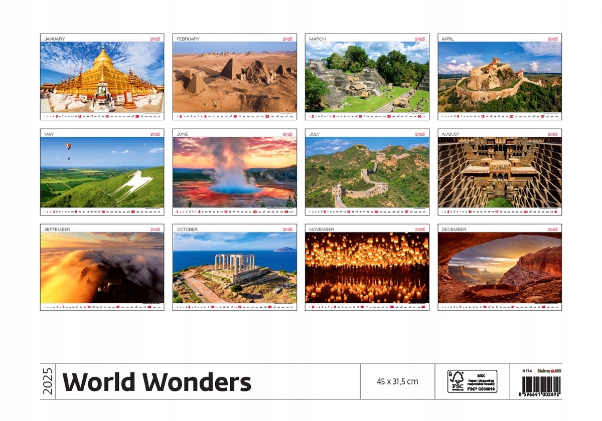 ЧУДЕСА МИРА (CUDA) МИР) — красивый настенный календарь на 2025 год издательства Helma 365. Коллекция потрясающих фотографий, опубликованных в большом формате. Эта игра наверняка покорит сердца всех любителей дальних путешествий и необычных мест. Красиво опубликованные уникальные фотографии показывают захватывающие руины древних зданий, монументальные скульптуры и произведения архитектуры, египетские пирамиды и чудеса природы. На каждом календаре изображено одно из самых необыкновенных мест в мире. Эти фантастические фотографии можно будет с успехом использовать в качестве плакатов после конца 2025 года.