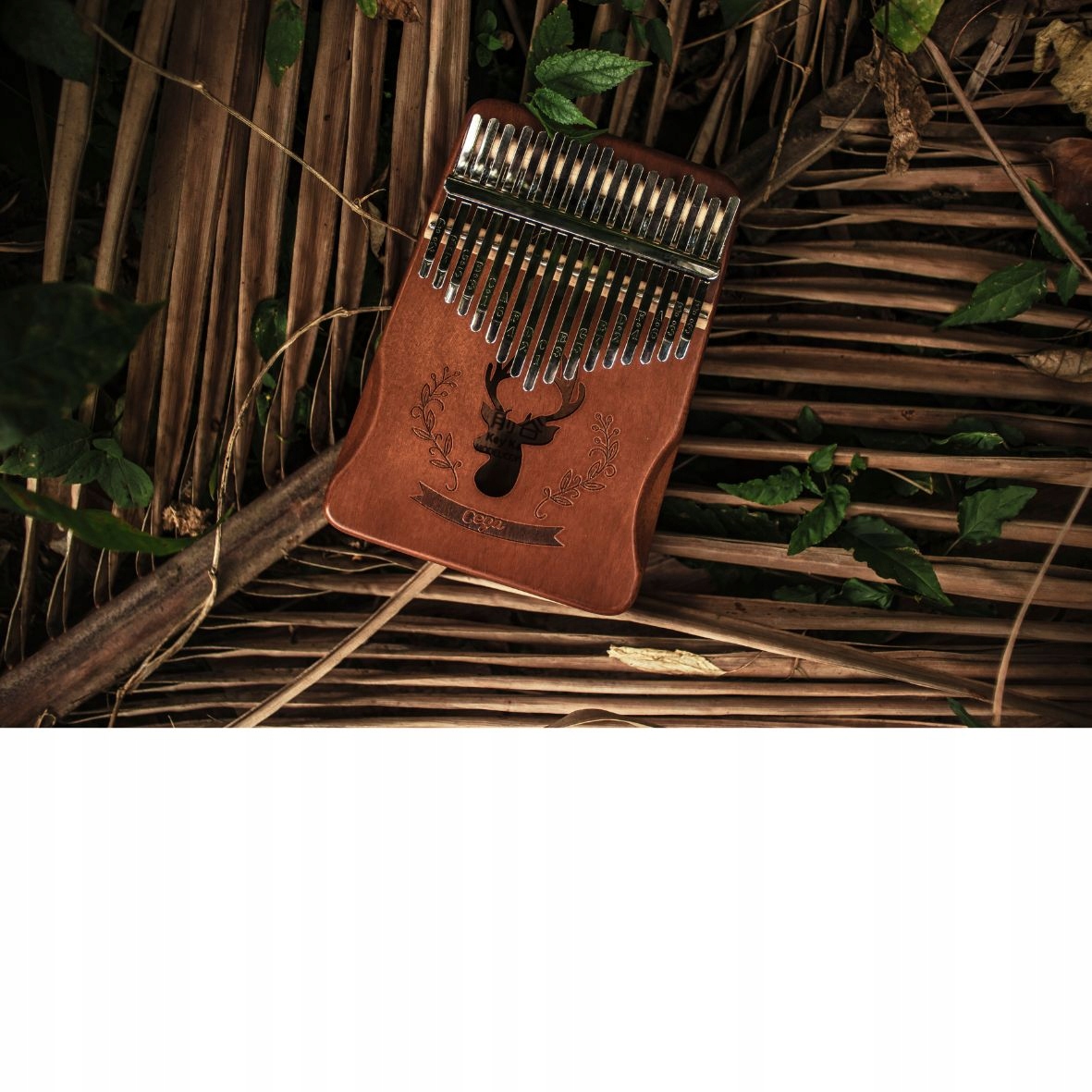 - Оригинальная калимба, полностью деревянная, с декорированным звуковым отверстием с мотивом оленя