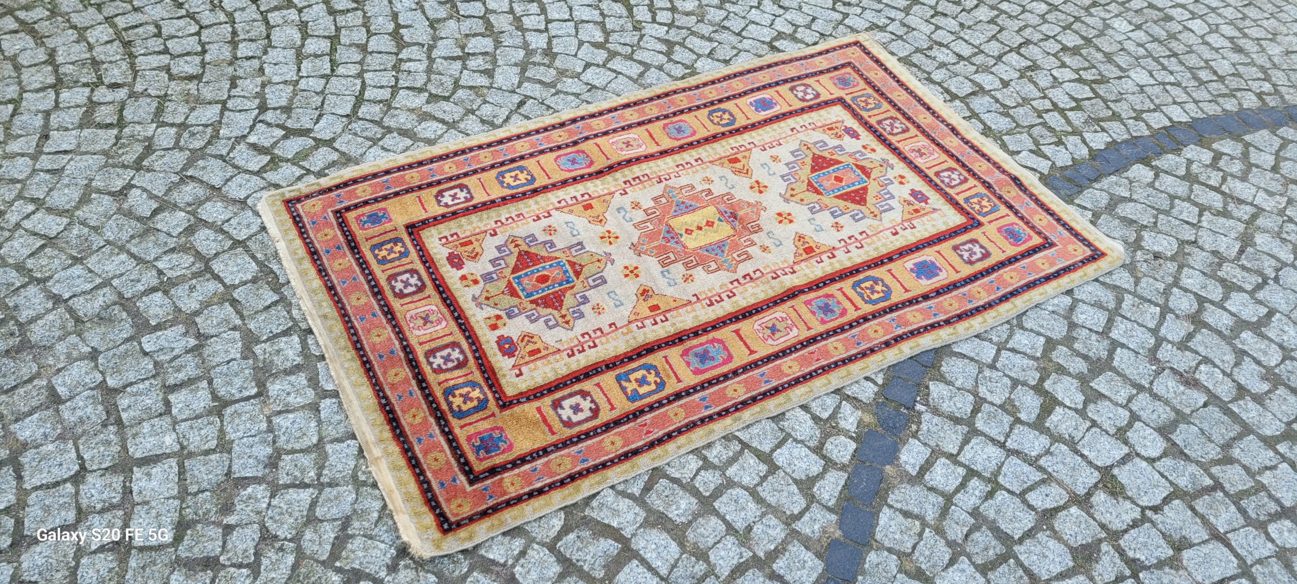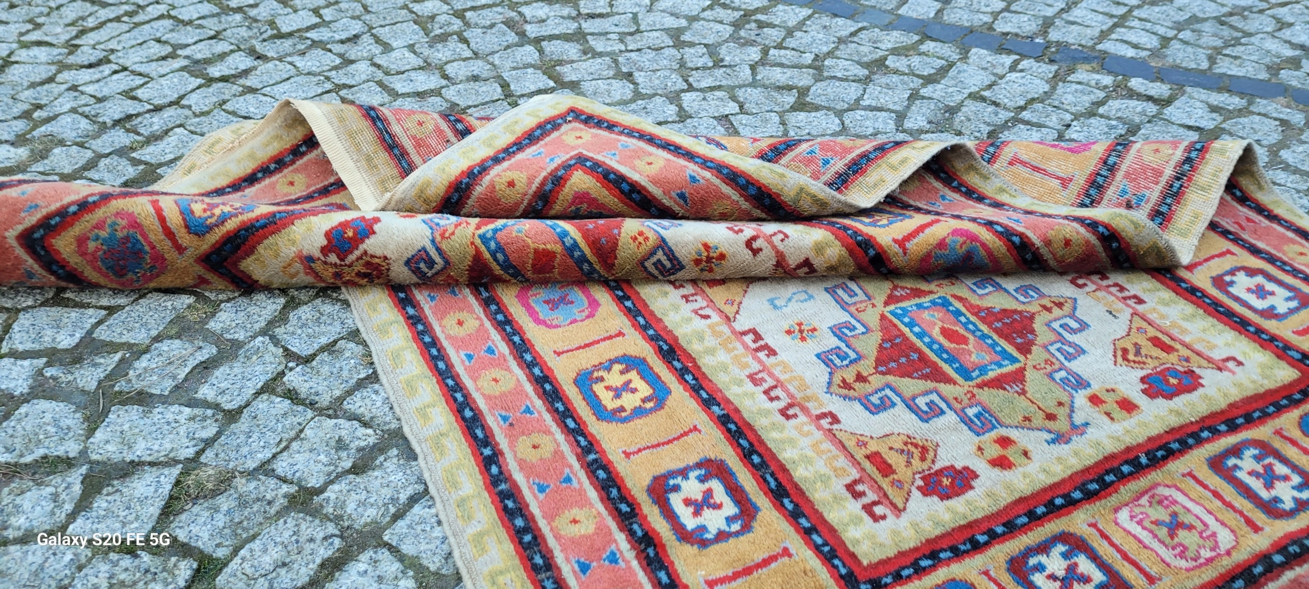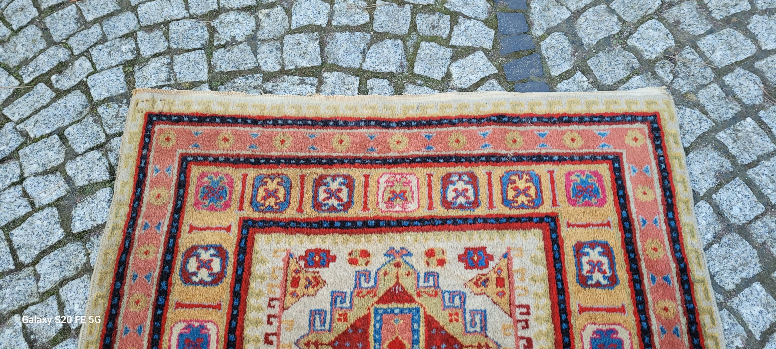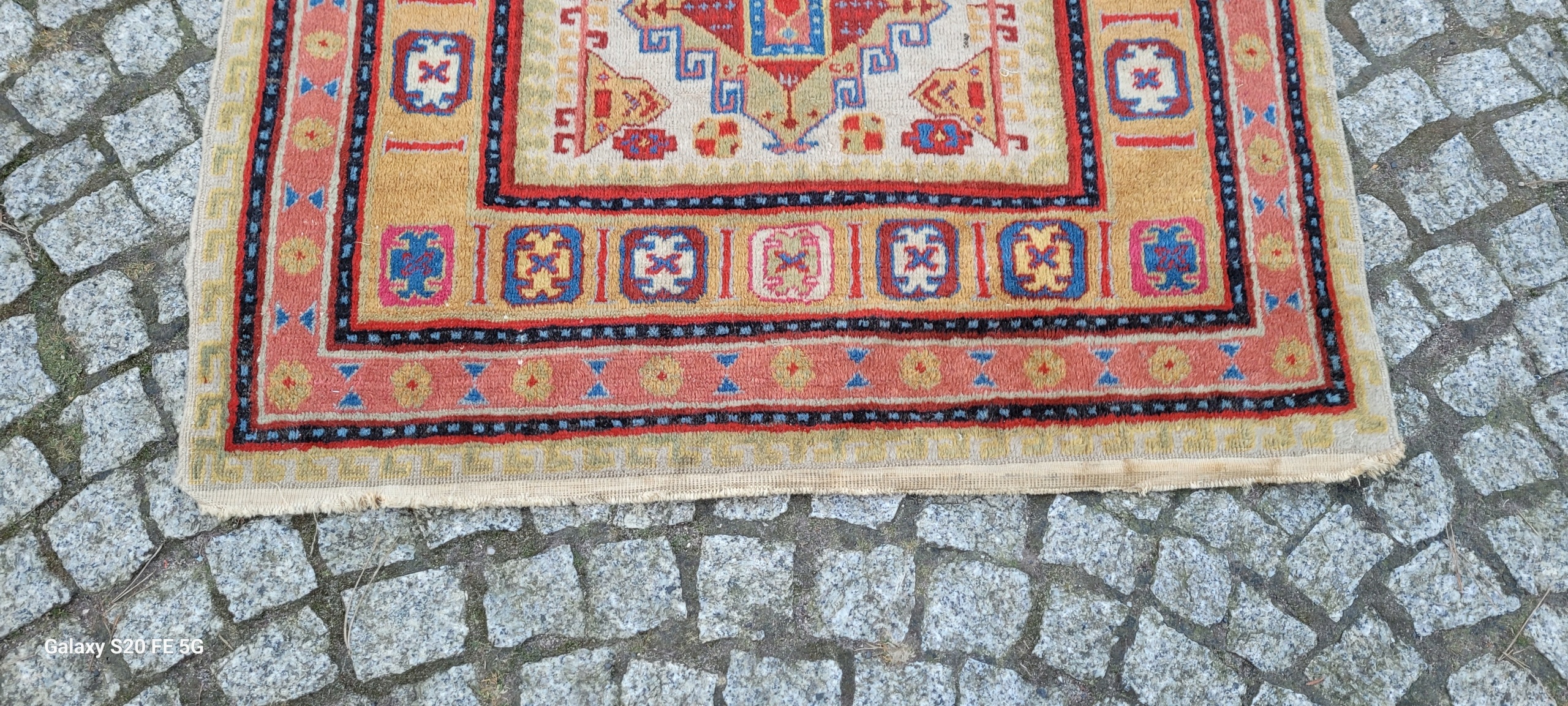 Кавказский казахский ковер. Сплетен вручную из шерсти. Характеризуется компактным, приятным на ощупь флисом, красивыми цветами и узорами. Состояние хорошее, видно на фотографиях. Имеет потертости и загрязнения.