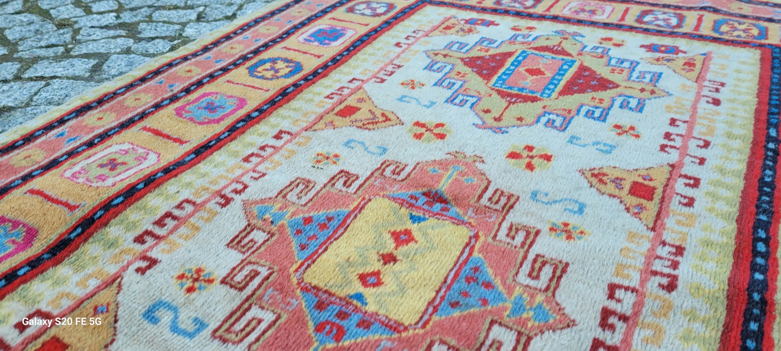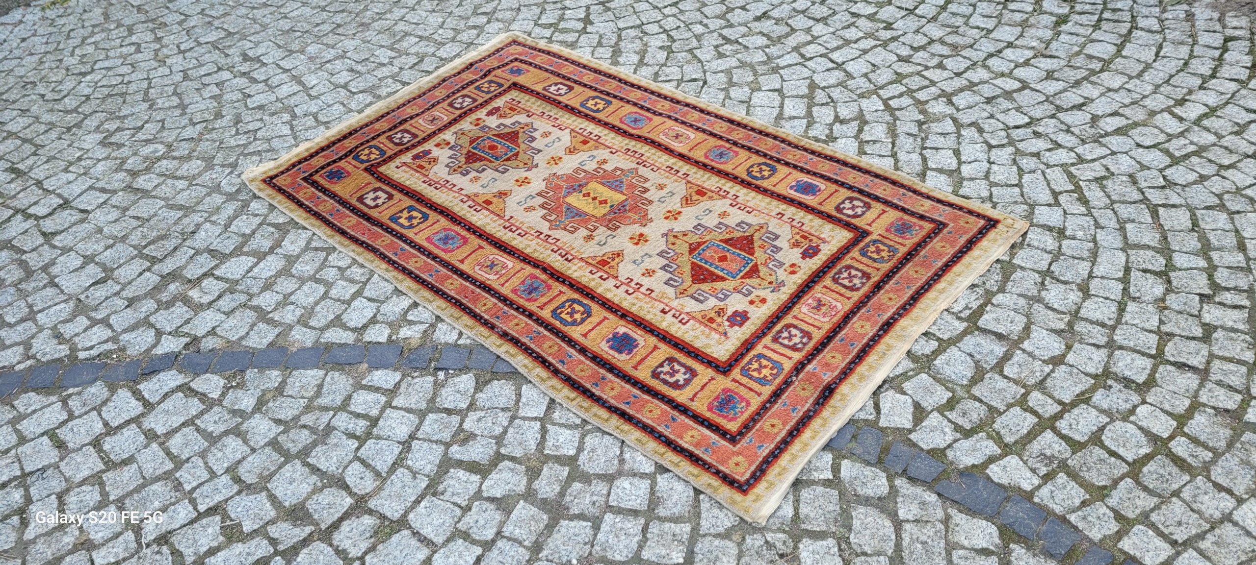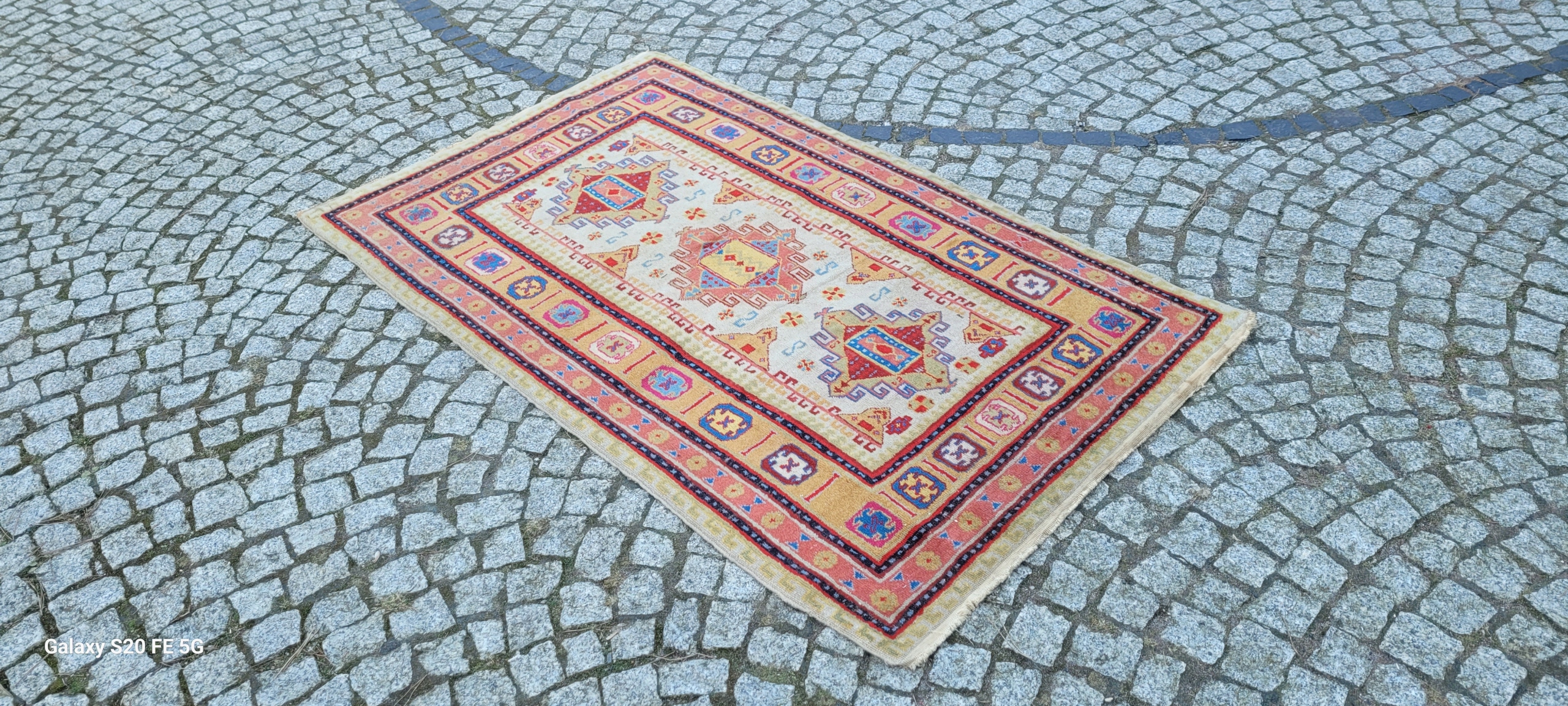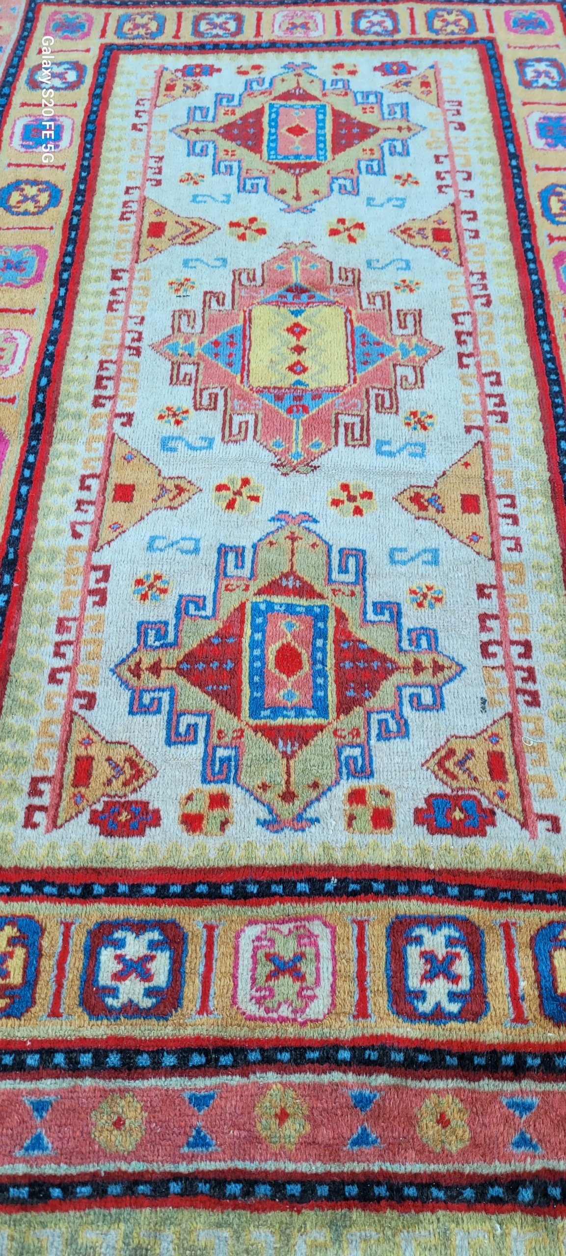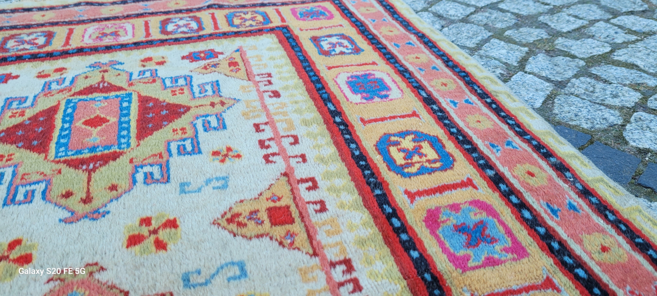 Кавказский казахский ковер. Сплетен вручную из шерсти. Характеризуется компактным, приятным на ощупь флисом, красивыми цветами и узорами. Состояние хорошее, видно на фотографиях. Имеет потертости и загрязнения.
