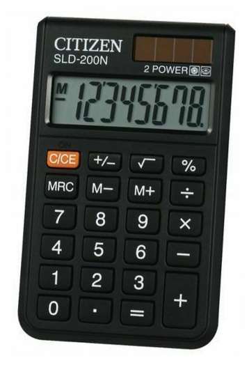 Калькулятор карманный SLD-200N CITIZEN 8-значный/98x60мм - с 8-значным дисплеемдвойная система питания (солнечная батарея и батарейки)размеры: 98x60x10мм функция расчета квадратного корня и процентовоснащен клавишей смены знака автоматически отключается гарантия 2 годацвет : черный
