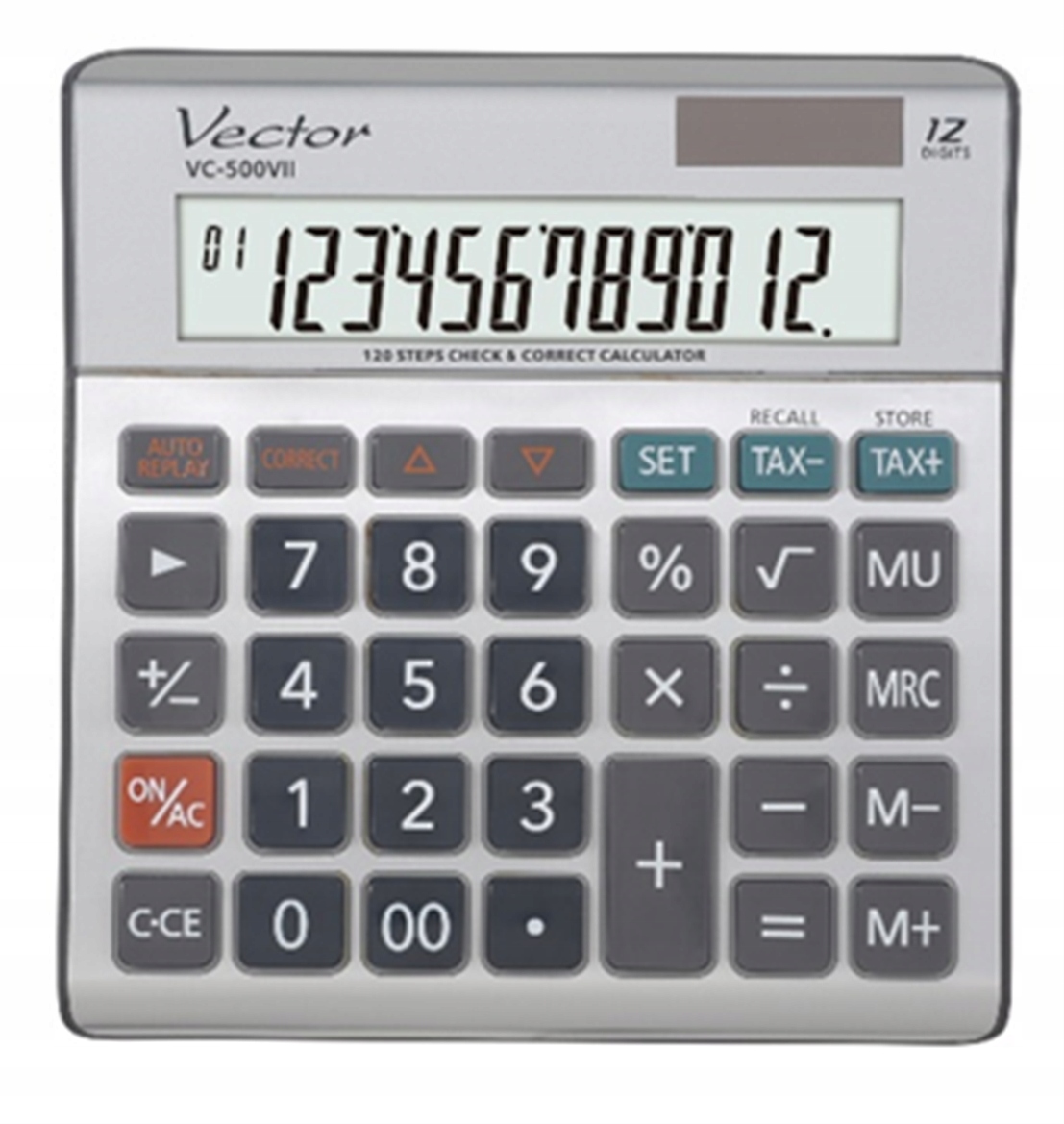 Калькулятор офисный Vector VC-500VII - память на 120 шагов расчета с возможностью их проверки и корректировки, память, проценты, квадратные корни, реверс, клавиша двойного нуля, налоговые расчеты (НАЛОГ, НДС), двойное питание , 12-значный дисплей