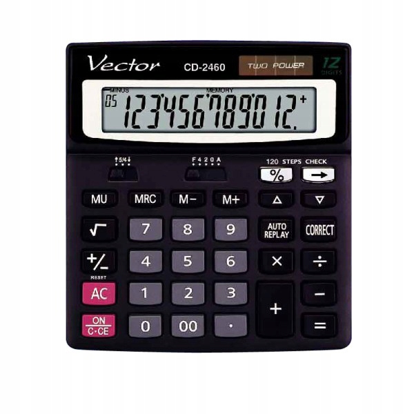 Многофункциональный калькулятор Vector CD-2460 — это больше, чем просто: основные функции каждого калькулятора, а также такие, как расчет квадратный корень, сохранение в памяти, проверка и исправление (проверка и исправление ошибок), округление результата i другое.
