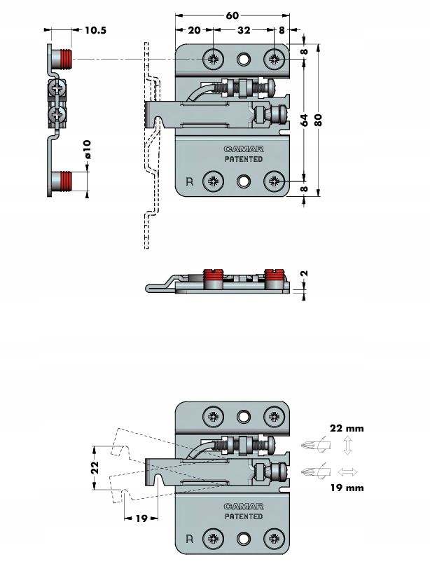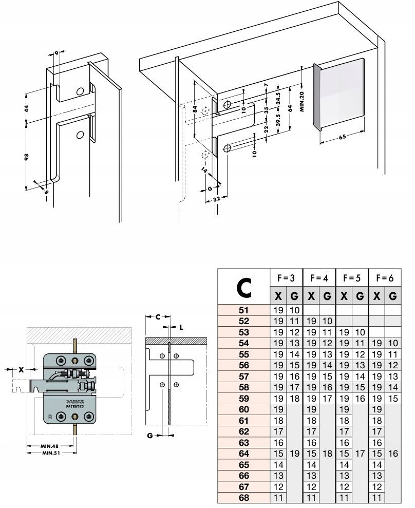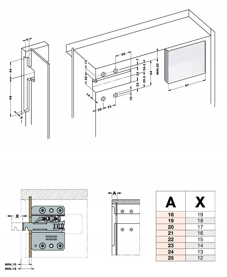 Подвесной комплект CAMAR 807 RV отличается конструкцией, позволяющей устанавливать выдвижные ящики на всю глубину шкафа. Для установки подвески отфрезеруйте ее согласно схеме.