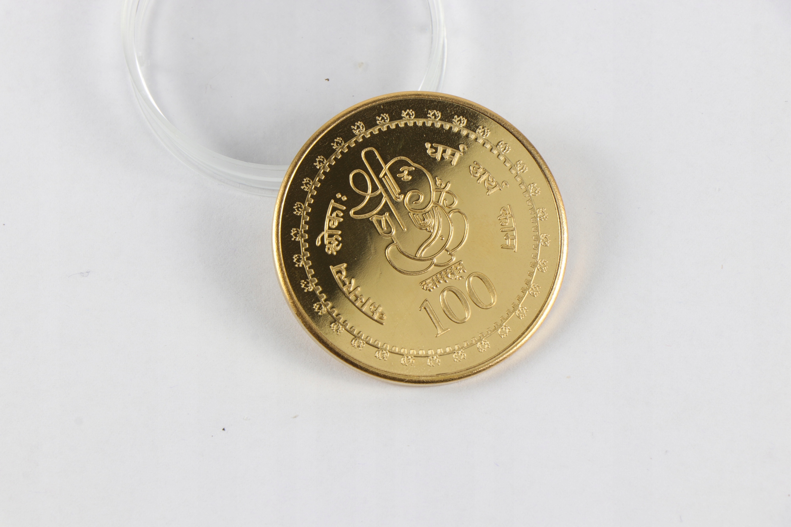 Золотая монета из серии рупий Камасутра 100. Монета упакована в пластиковый корпус.