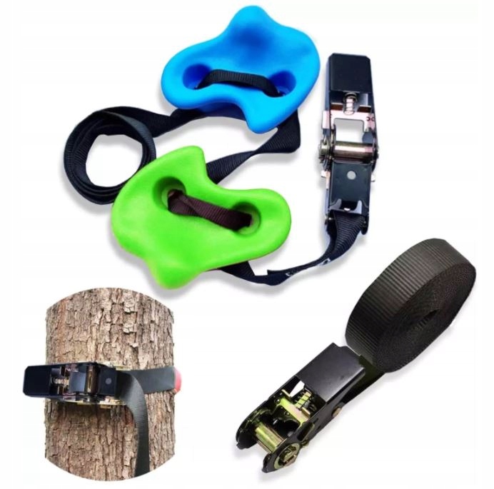 - В комплект входят 10 разноцветных камней для лазания и 4 ремня с храповым механизмом.