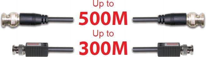 Передача сигнала в разрешении HD по коаксиальному кабелю до 500 м, по витой паре Cat-5e до 300 м.