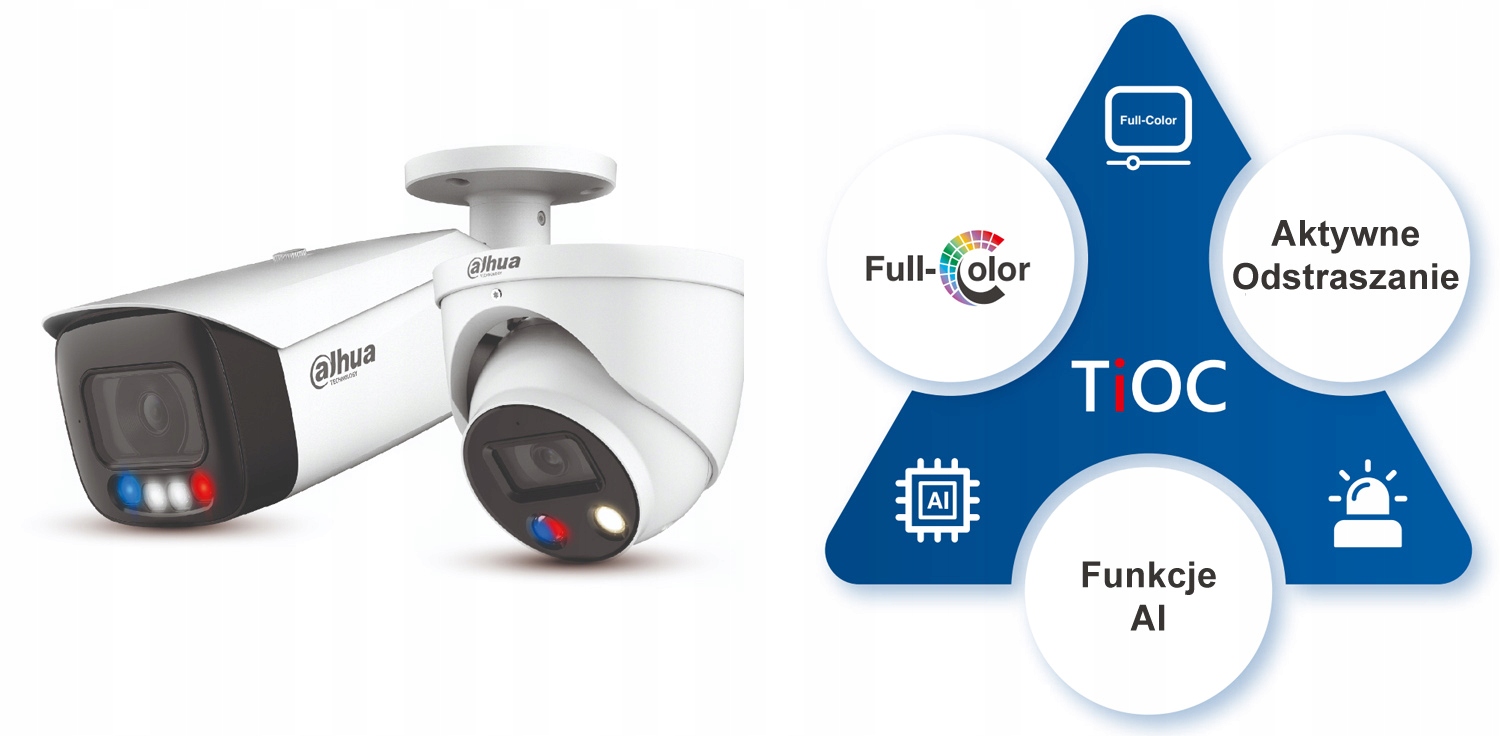 Dahua TiOC, также называемая камерами Dahua 3-в-1, представляет собой современное поколение камер наблюдения, входящих в серию Dahua WizSense. Устройства TiOC сочетают в себе 3 инновационные технологии: Dahua Full-Color (цветное изображение 24/7), функции искусственного интеллекта AI и активное аудиовизуальное сдерживание. Камеры Dahua TiOC обеспечивают еще более точную идентификацию обнаруженной угрозы с одновременной возможностью ее сдерживания с помощью световых и звуковых сигналов.