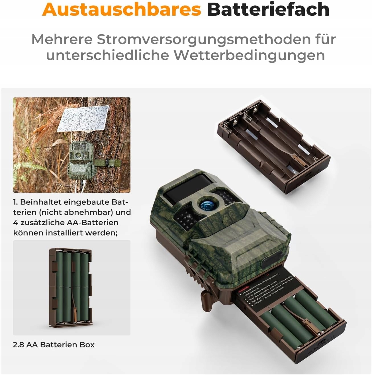 【 Революционные методы многократного питания в течение 365 дней непрерывной мощности 】 Лесная камера K & F Концепция 4K 48MP имеет уникальную конструкцию с двумя батареями. Один карман для встроенной батареи и 4 литийных батарей. Вместе с солнечной панелью камера наблюдения за животными может работать непрерывно в течение 365 дней. Несколько энергетических методов помогают справиться с различными погодными условиями, такими как облачные и дождливые дни