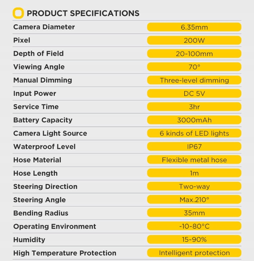 Он оснащен 5-дюймовым IPS HD-дисплеем для показа фотографий. и видео сложных зон осмотра и ознакомьтесь с цилиндрами двигателя, клапанами, поршнями, свечами зажигания дизельных двигателей и электронными компонентами в поршнях с близкого расстояния.