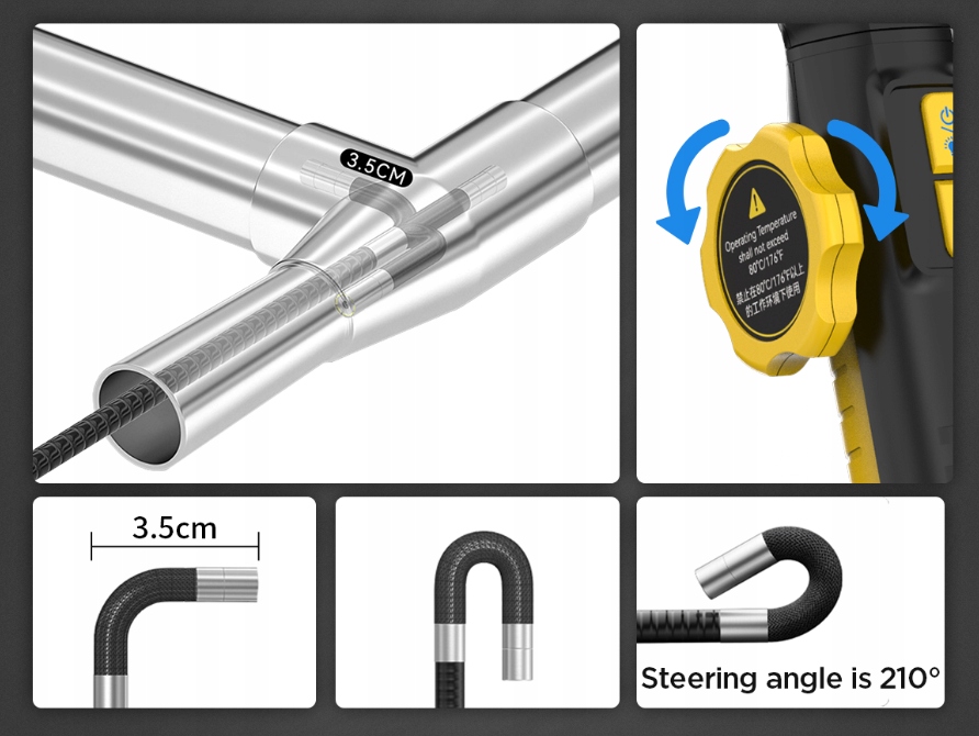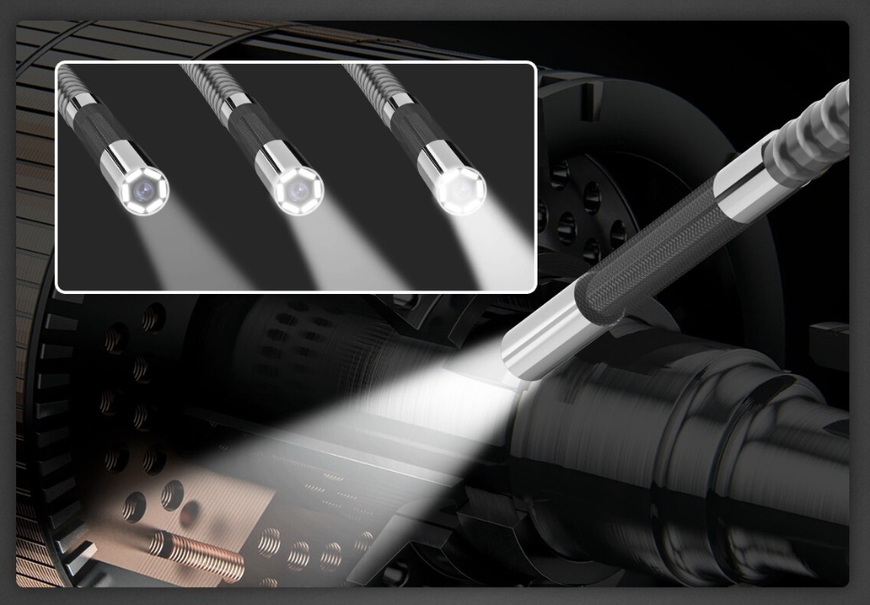 Поверните ручку, и маленький зонд сможет проникнуть внутрь. в узкое и гибкое пространство, в которое трудно войти, например, в трехходовой каталитический нейтрализатор и т. д.