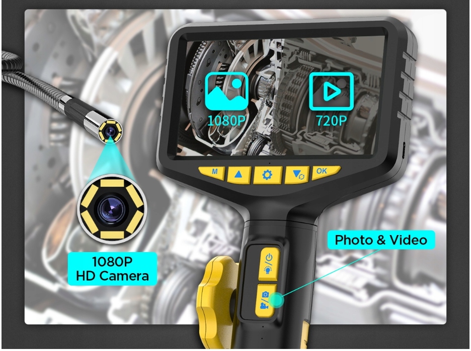 HD-камера 1080P проникает в узкое пространство, затем четко покажите видео и фотографии на 5-дюймовом дисплее.