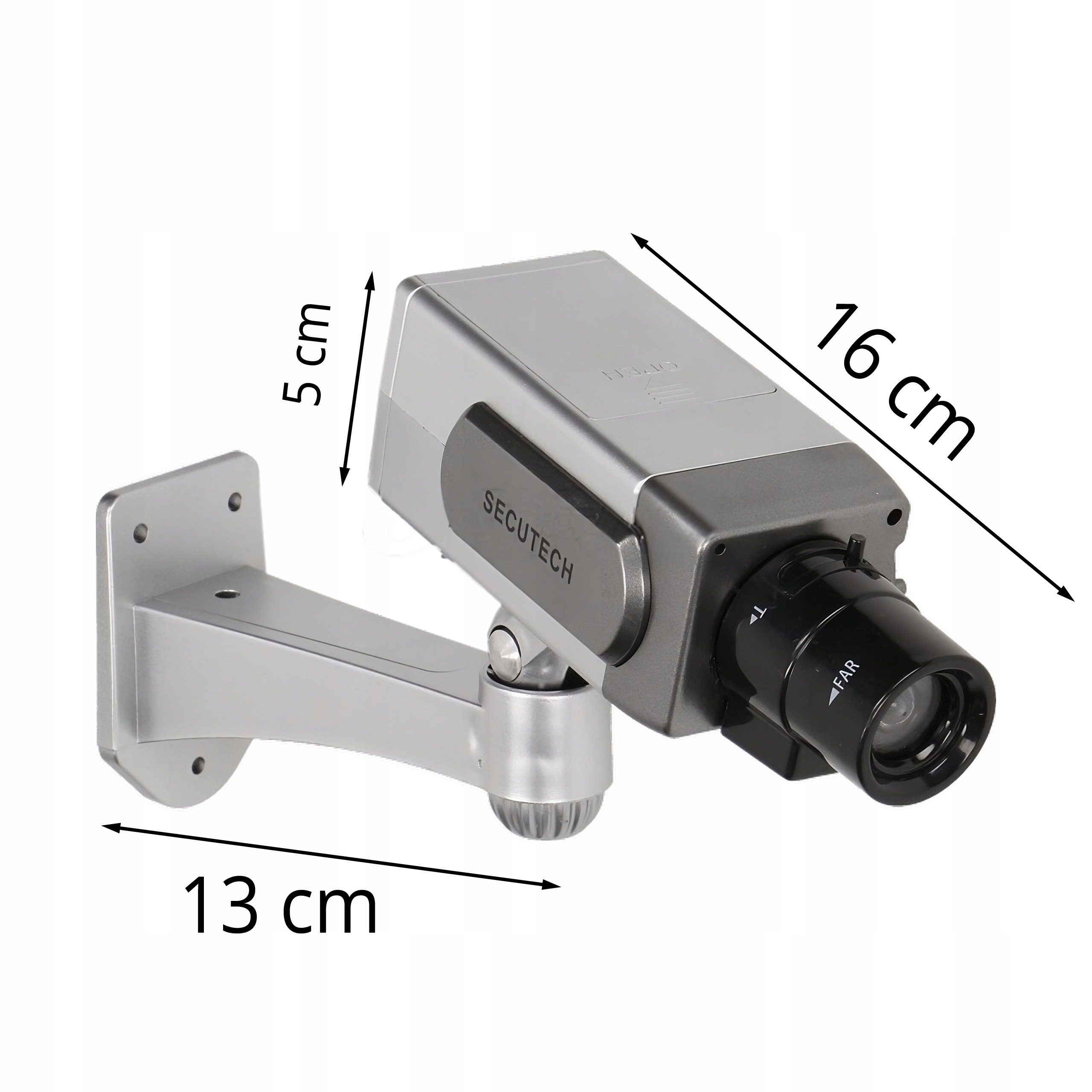 Dummin -это высокое качество имитация реальной камеры мониторинга видеонаблюдения. Мигающий красный светодиод создает впечатление 24 -часового мониторинга. Благодаря размерам традиционной компактной камеры, это неузнаваемо для любых свидетелей. Это защитит вашу собственность от потенциальных воров и заставит вас чувствовать себя более безопасным