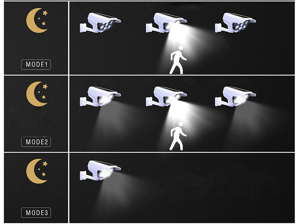 Высококачественная камера Dummy - это устройство, которое питается солнечной панелью , которое гарантирует освещение без дополнительного источника питания. Он оснащен очень яркой панелью 77 светодиодных точек початка с сильным световым потоком.