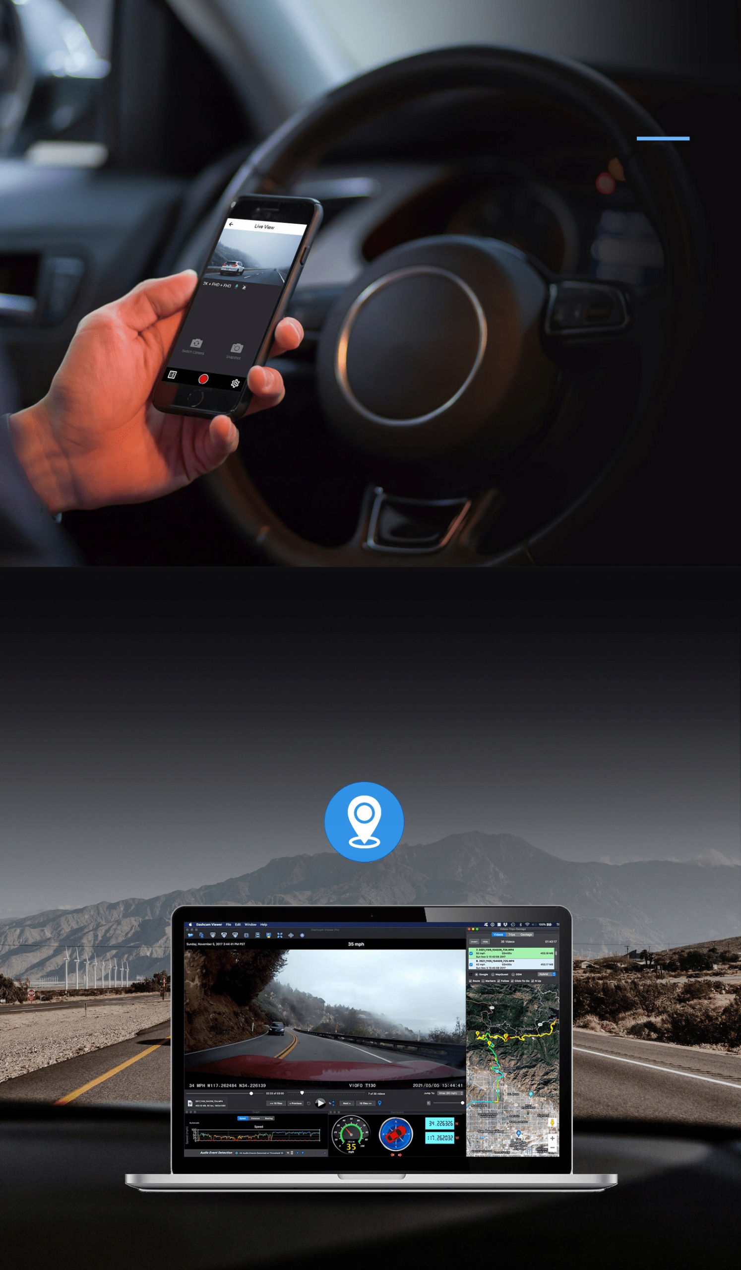 3-канальная камера T130 оснащена встроенным эффективным модулем Wi-Fi, работающим в диапазоне 2,4 ГГц. Благодаря этому мы можем управлять камерой с помощью специального приложения VIOFO, которое бесплатно для Android и iOS.