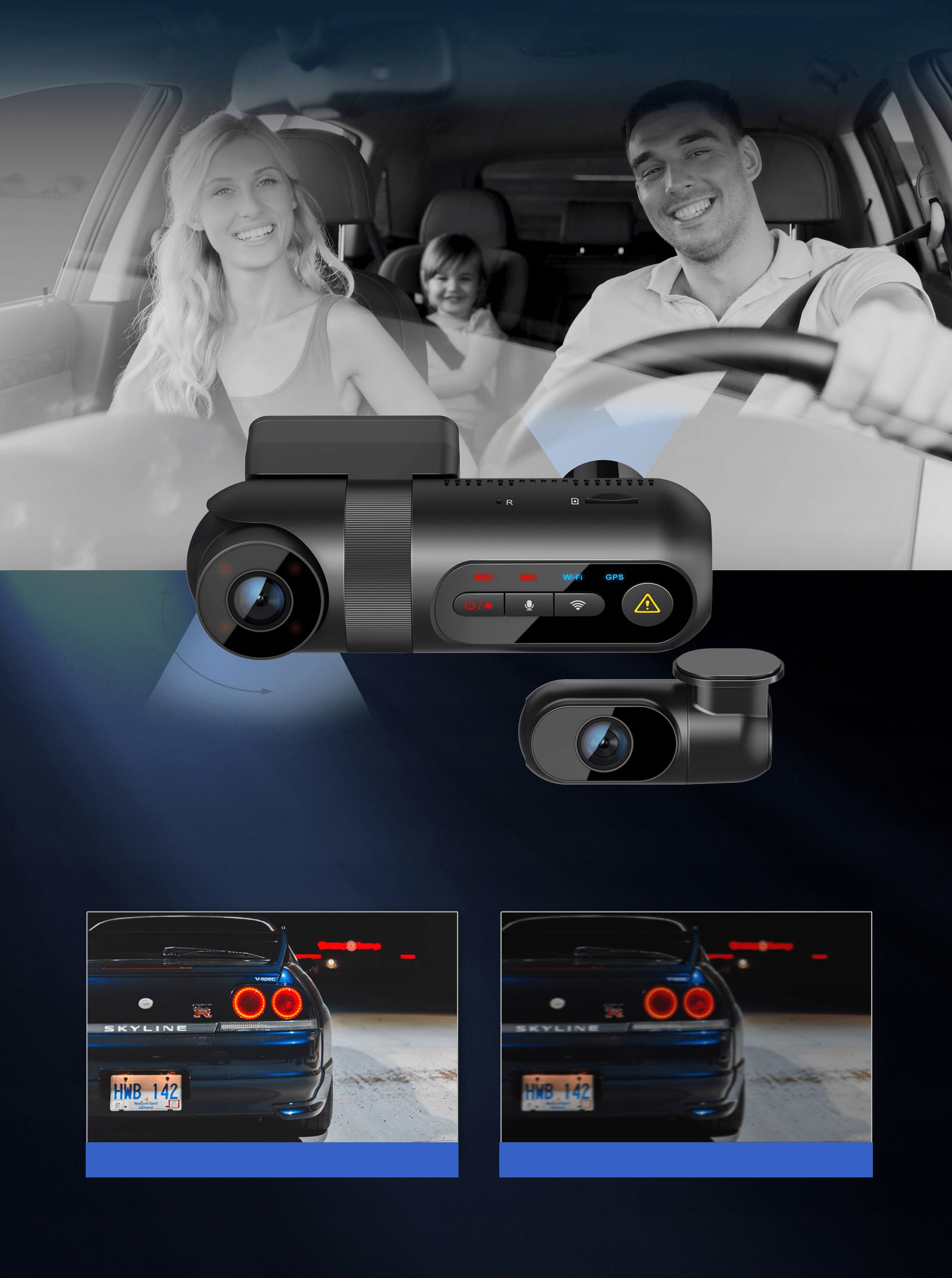 - Внутренняя камера с легким изменением угла и положения записи! Запишите интерьер автомобиля и быстро наведите объектив на водительское окно!