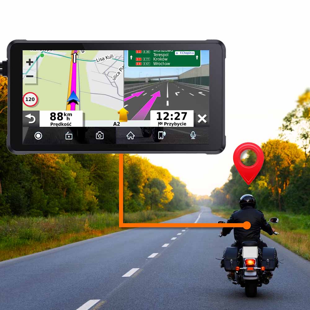 - Мотокамера с GPS-навигацией — большой, четкий сенсорный экран диагональю 5,5 дюйма с технологией IPS. Поддержка Google Maps, Yanosik и других приложений GPS-навигации.
