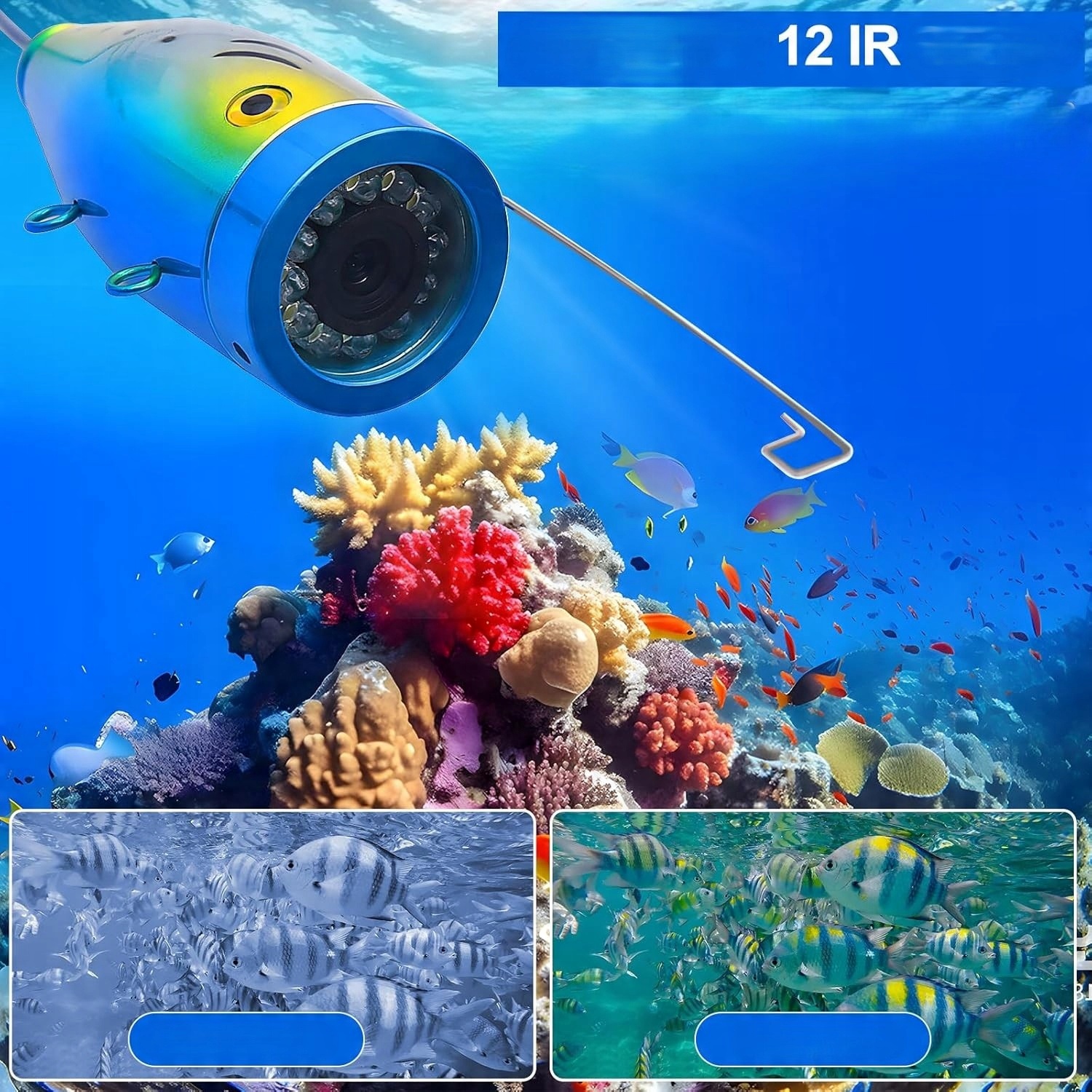 - [изображение с высоким разрешением] --- HD 1000TVL Fishing Camera предлагает изображения с высоким разрешением для записи и просмотра подводных сцен в режиме реального времени, обеспечивает визуальные впечатления под водой и увеличивает удовольствие при рыбалке