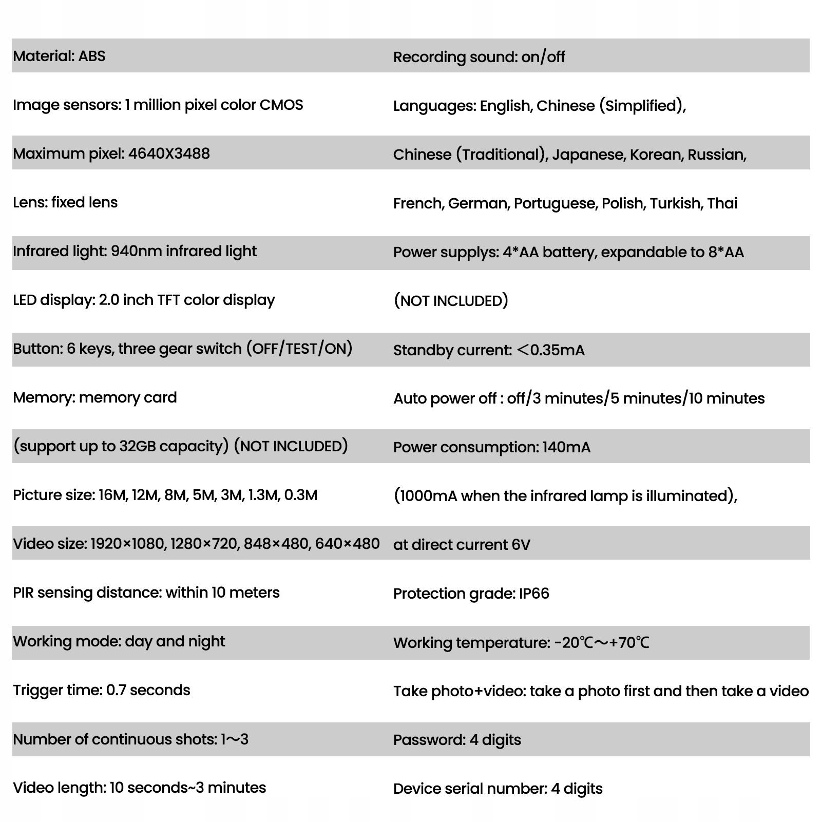 Specification: H2> - Element type: Trail camera