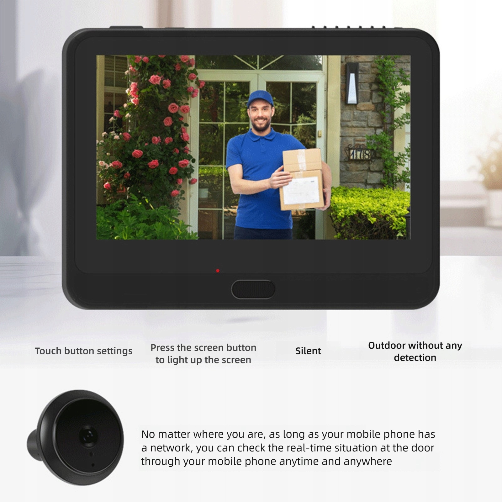 3. Обнаружение PIR: эта интеллектуальная дверная камера Na имеет функцию обнаружения движения с помощью датчика движения PIR, который может автоматически обнаруживать движение человека и активировать push-сообщения и видео, хранящиеся на небольшой карте памяти (не входит в комплект) или мобильном телефоне, в течение нескольких секунд.