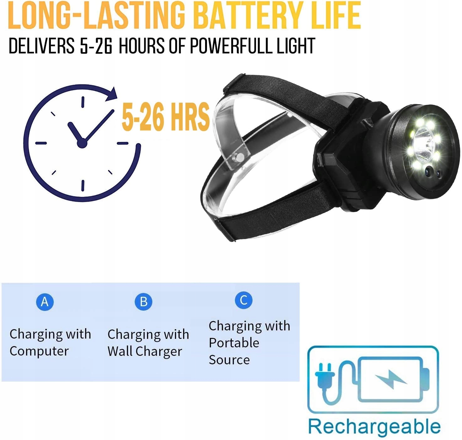 🏃 Покани на большой литиевой батареи 4000 мАч могут работать непрерывно в течение 5-26 часов и обеспечивает максимальный диапазон света в 300 м/984,2 фута. Свежий воздух. Даже в узких пространствах. Быстро выберите один из 2 режимов освещения. (Весь режим режима света или вспомогательного света), который поддерживает защиту, техническое обслуживание сада, дом, велосипед, походы, осмотр достопримечательностей, а также режим записи «все в одном» для записи каждого момента. Максимум 128 ГБ карты памяти (исключая)
