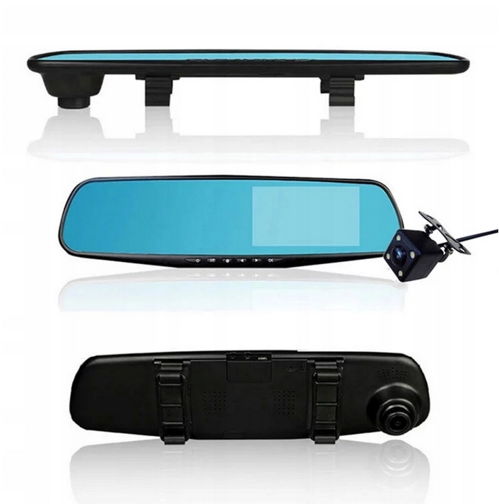 Видеорегистратор выполнен в виде накладки на зеркало заднего вида. В комплект входят резиновые крепления для крепления. Для этого вам не нужны никакие инструменты. Поверхность зеркала защищена защитной пленкой, а стекло слегка тонировано в синий цвет, благодаря чему солнечные лучи не отражаются, что улучшает видимость в зеркале. Ночью машины, следующие за нами, не ослепляют нас.