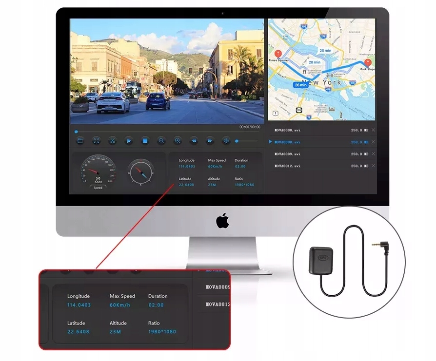 В случае столкновения или проверки полиции часто необходима информация о точном положении транспортного средства или его скорости в данный момент, поэтому регистратор также оснащен возможностью записи эти параметры. Каждый записанный кадр видео содержит информацию о скорости и GPS-координатах автомобиля.