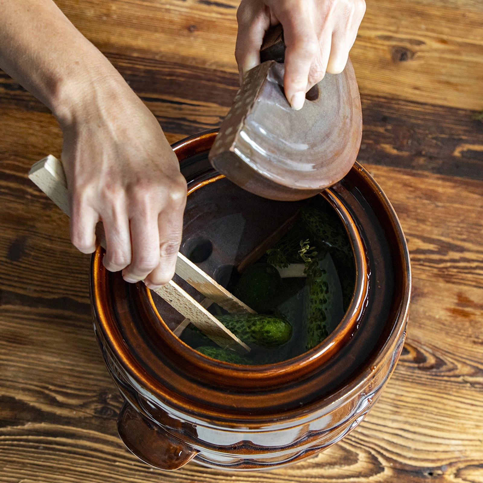 Хорошо -эфирное давление должно загружать овощи, чтобы воздух не возникал. При мариновании ствол / контейнер должен быть помещен в безопасное место, в комнате с комнатной температурой. Когда начинается ферментация молока, вам нужно убедиться, что овощи погружаются в сок с образованием. Поддерживая такие условия, силос может успешно храниться в течение нескольких месяцев, не опасаясь, что плесень или бактерии будут появляться под камнем (как это может произойти при использовании деревянного давления).
