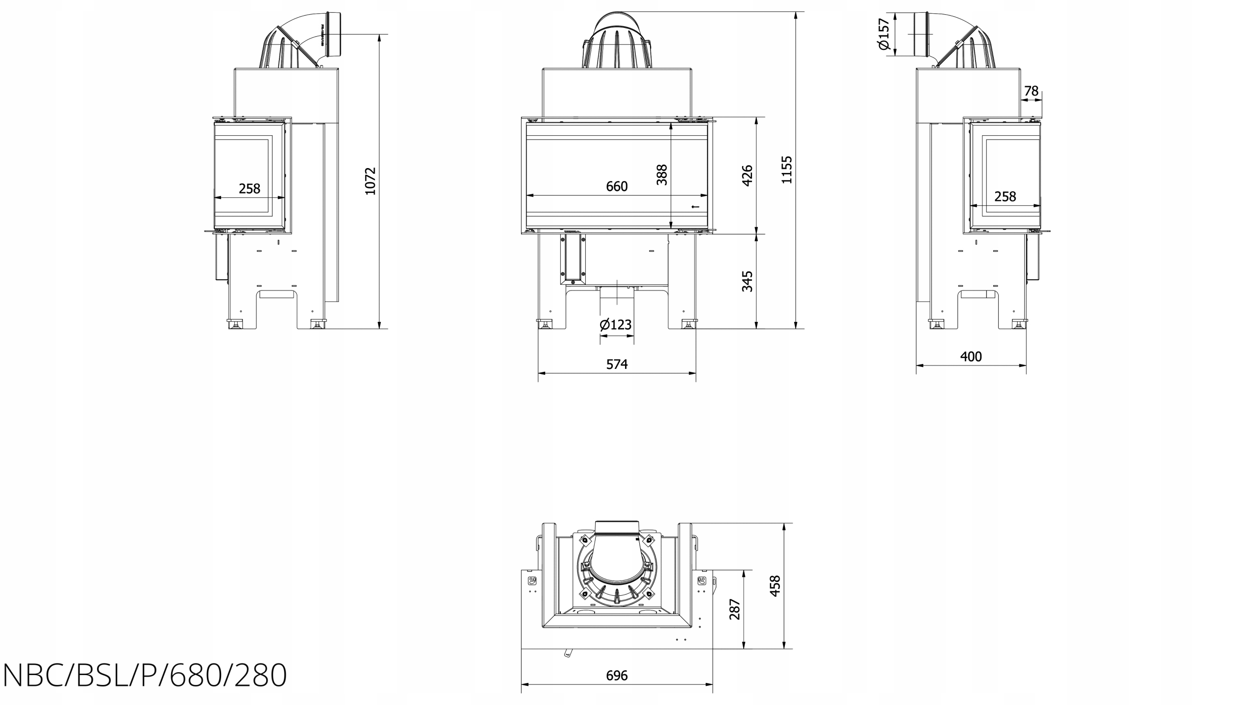 NBC 600x280 7 кВт влево/Правый BS, открытый в сторону с трехпользованным видением огня, подкладка Acumotte и потребление воздуха
